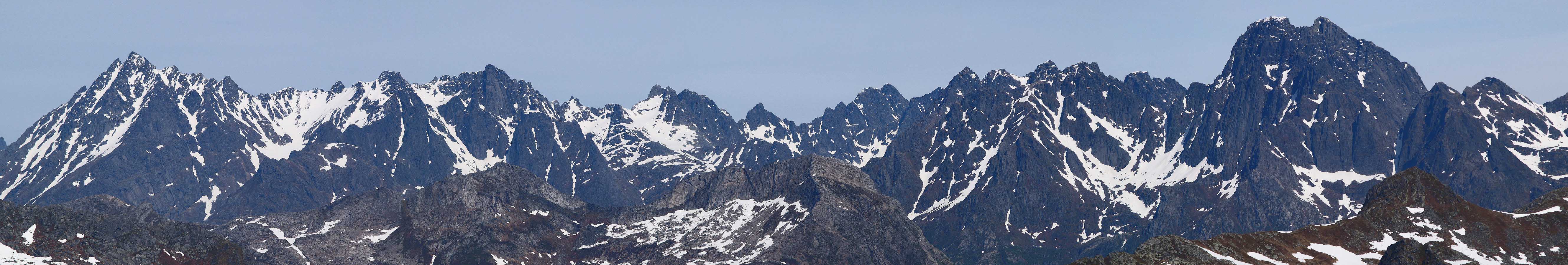 25. Tindeverdenen på Austvågøy i Lofoten må være noe av det fineste Norge har å by på for tinderangling. Det at området også inneholder Norges vanskeligste topp å bestige (Trakta), bidrar selvsagt også til å gjøre det attraktivt. Panoramabildet nedenfor viser området mellom Higravstind og Rulten. Bakenfor og skjult i bildet ligger tindene ut mot Raftsundet med bl a Trolltindene og Trakta.