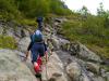 24. Det var nå voldsomt. På mine turer over ryggen har jeg hatt kun et fåtall kiler og slynger og et 40 m, 9 mm tau. Kamkiler har jeg overhodet ikke hatt. Deler en V-skaret i to taulengder, klarer en seg med en eneste mellomforankring med en passelig liten kile. På Patchells sva har vi benyttet pendeltauet som NTK har hengt ut.