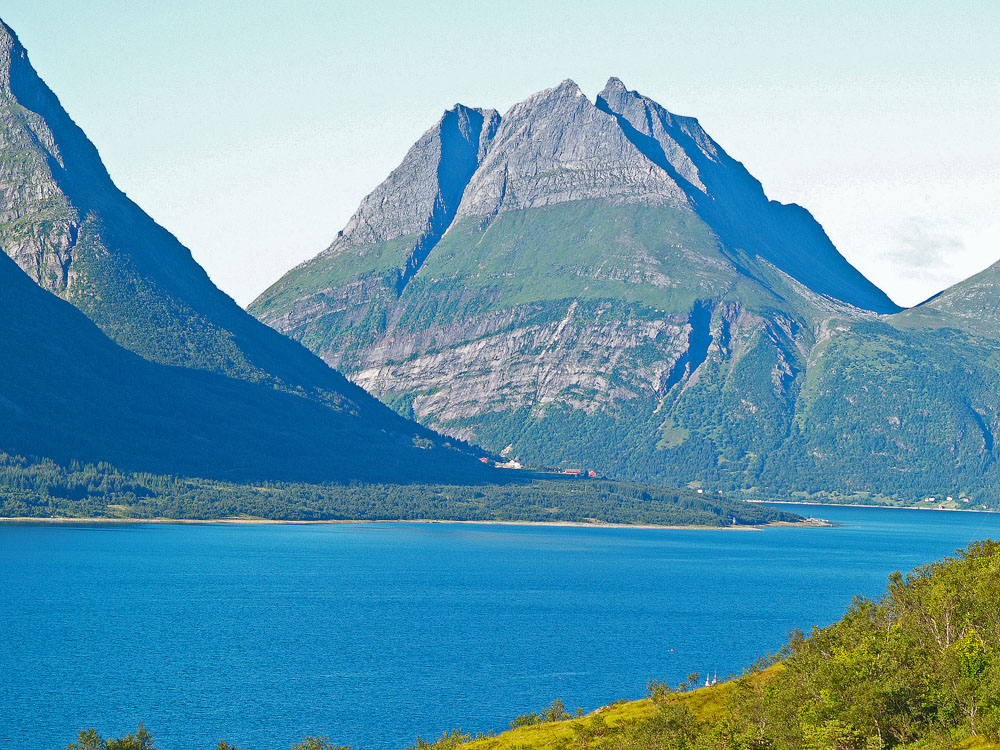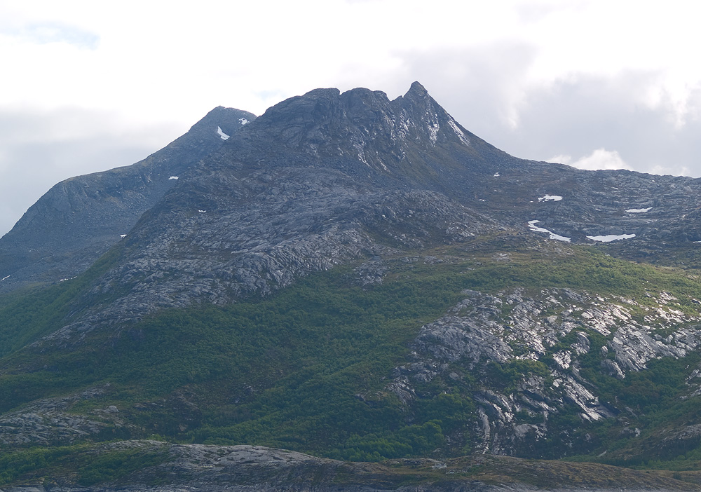 18. Legger inn bilder av Elvasstind sett fra vest-nordvest og Nonstind sett fra Haugland i Aldersundet. Pillaren som fører opp til nabotoppen til til venstre for Nonstind (Nonstind er toppen lengst til høyre i bildet) ble i sin tid besteget av to menn fra Aldersundet av en generasjon eldre enn meg. De brukte visst teknikken fra pionertiden med å stå på hverandres skuldre. Litt info om Liatind som er det siste bildet. Den nærmeste toppen er Omegatoppen som tidligere hadde en antenne som strekte seg over sundet til Aldertind (som stiger opp helt til venstre i bildet). Da gikk vi opp den markerte ryggen som går opp mot venstre og ender på toppen. På de vanskeligste stedene var det satt opp jernstiger. Min eldste sønn og jeg gikk videre vestover eggen til Vesttoppen helt til venstre. På et sted måtte vi krype gjennom et hull i eggen for å komme videre. Da en barndomskamerat og jeg besteg den høyeste av toppene vi ser på bildet (en litt høyere topp lenger bak er skjult), gikk vi delvis på og delvis bak den markerte eggen mellom sol og skygge som fører rett opp mot toppen fra høyre. Bak skaret mellom denne og Omegatoppen står det en høy pinakkel som iallfall på det tidspunktet (rundt 1980) ikke var besteget.