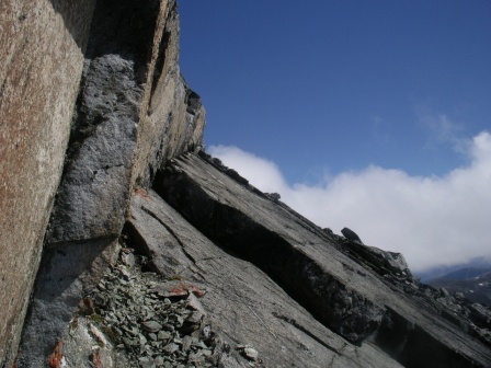 Hei Gikk Memurutindene i sommer fra Veoskar til Store, til vesttoppen og østtoppen og tilbake igjen, derfra videre sørover ryggen til og med 2230 (V-4) og ned Jerveløyfti. Ryggen mellom St. Memurutinder (vesttoppen og østtoppen) har (fra vesttoppen mot østtoppen) et par bratte nedganger (en av de er etter den midtre av toppene på eggen) I tillegg er det to passasjer som har bratte sva mot sør, en ganske tidlig på eggen, og en senere når du passerer den markerte to-fargede hammeren på sørsida (ref. fingertak i et riss slik det omtales i noen fjellbøker). Se også bildet for denne passeringen. Fra østtoppen og ned i Memuruskardet kjenner jeg ikke til. Hammeren nord for V3 (2243). som vi klatret opp fra nord mot syd, gikk vi først noen meter med klyving før standplass og deretter fire-fem mellom-forankringer opp til toppen. Det skal holde med 60 meters-tau her, men det litt avh. av hvilken linje man følger ned, og hvor langt man må rappellere. Det er greit å finne rappellfeste på toppen (men med snø og is kan jo ting bli litt mer tricky). -
