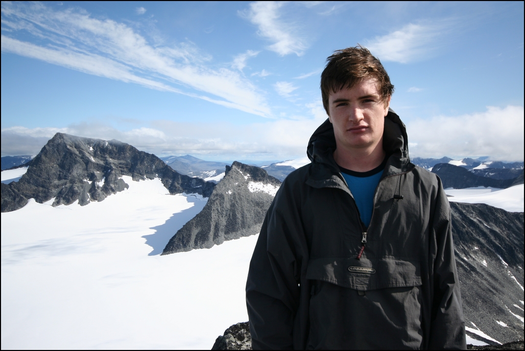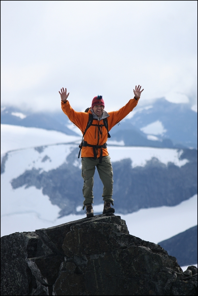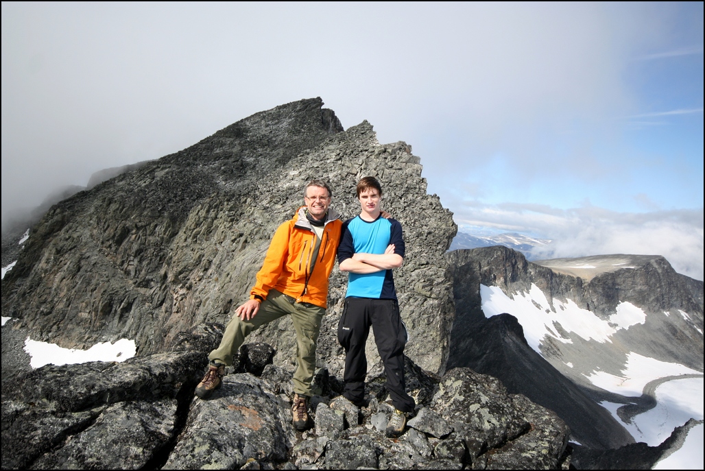 Er ganske fersk her inne, men tenkte jeg måtte prøve meg på en turrapport Yr meldte nydelig vær i Jotunheimen og jeg og pappa kjørte derfor fra Sogndal søndags morgen for å sanke noen topper. Dagens turmål var vi ikke helt sikre på, så vi tenkte vi skulle se an hvor skyene sprakk opp først. Da vi kjørte oppover mot Turtagrø lå skyene som vanlig fortsatt ganske lavt. Vi bestemte oss derfor rimelig kjapt for å kjøre litt videre, trolig til Leirdalen. Vi så at skydekket var omtrent like lavt overalt, men satset på en tur til Skardstind uansett. Det skulle seinere vise seg å være et særdeles godt valg Vi begynte å gå fra Geitsætre klokken 10.00. Etter 2t +/- tok vi en rask lunch siden det nå var noen timer siden frokosten ble inntatt hjemme i Sogndal. Fram til nå hadde ikke sola vist seg i noen større grad, men da vi gikk opp mot Dumhøeplatået brøyt skylaget seg nesten helt opp. Og da fikk vi øye på Skardstinden! Fra denne vinkelen så den virkelig mektig ut, spesielt med Nåle nede til høyre. Jeg kjente jeg ble skikkelig gira på litt klyving, men fra denne vinkelen så det nesten for krevende ut! Men før vi tok til på selve Skardstinden skulle vi bortom Dumhøe, før vi gikk bort til Vestre Skardstinden. Fra Vestre klatret vi den første hammeren, før vi rundet de tre neste i flanken til høyre som beskrevet i "Norges Fjelltopper over 2000 meter". Det var her det vanskeligste klyvepunktet var, men her var det ikke veldig luftig så det gikk rimelig greit. Videre bortover flanken var det veldig løst, og tidvis vått. Etterhvert kom vi til en bratt snøflekk. Vi hadde ikke med stegjern og bare en isøks i tilfelle vi skulle få bruk for den. Vi fant raskt ut at vi ikke greide å krysse snøflekken, og gikk derfor rett oppover i stedet. Vi skrådde opp en liten hammer til høyre, men denne var veldig grei å klatre med unntak av litt is her og der. Fra denne var det enkelt opp til toppen. På toppen stoppet vi litt, nøt utsikten i kombinasjon med finværet, og tok noen bilder. Planen var og fortsette videre ned til Nåle, men vi var litt usikre på hvor krevende dette var. Fra Dumhøeplatået hadde vi sett at det lå et tynt lag nysnø der, men det viste seg å bli problemfritt. Oppstigningen til Nåle gikk veldig greit(men det var litt isete akkurat her). Samme gjorde nedstigningen. Dette var dagens 4. 2K topp og vi var godt fornøyde Returen bort til Dumhøeplatået gikk nedenfor snøfonna i flanken, og videre samme rute som vi følgde opp. Når alt det bratte var unnagjort tok vi noen kjappe brødskiver før vi løp ned igjen til bilen ved Geitsætre. Grunnen til løpinga var at pappa på død og liv skulle rekke 2. omgang av adeccoligakampen Notodden - Sogndal. Pappa er vel et stort hakk mer fotballinteressert enn meg, men jeg måtte jo bare henge meg på. Fra Dumhøe brukte vi 1t og 20min. På turen samlet brukte vi 7t og 20min inkl. pauser. Alt i alt var det en nydelig tur i herlig vær. Legger ved noen bilder og:
