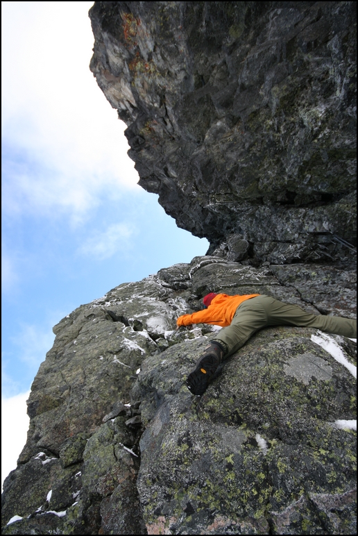Utrolig flott tur i perfekt vær. Endel snø, så klatringa tok sin tid. Men siden vi starta tidlig (04.00 fra Sogndal, begynte å gå fra Turtagrø 05.30), ble ikke dagslys noen hindring. Vi var helt alene hele turen, med unntak av ett følge på fem personer som vi møtte på vei ned svaene. Blir en kort rapport dette, men skal la noen utvalgte bilder tale for seg: Soloppgang over Søre Dyrhaugstind. Klokka er nesten 8, og helt ok morgensol møter oss på Bandet Matbit. Klargjøring av utstyr. Klatringa er i gang, her er vi vel nesten på Hjørnet tror jeg. Panorama fra hyllegalleriene, dette er vel det bilde jeg er mest fornøyd med. Stølsnostinder og Falketind. Hurrungane. Rappellen ned Sørvestveien. ... På vei tilbake til Turtagrø. Skagastølstindane -