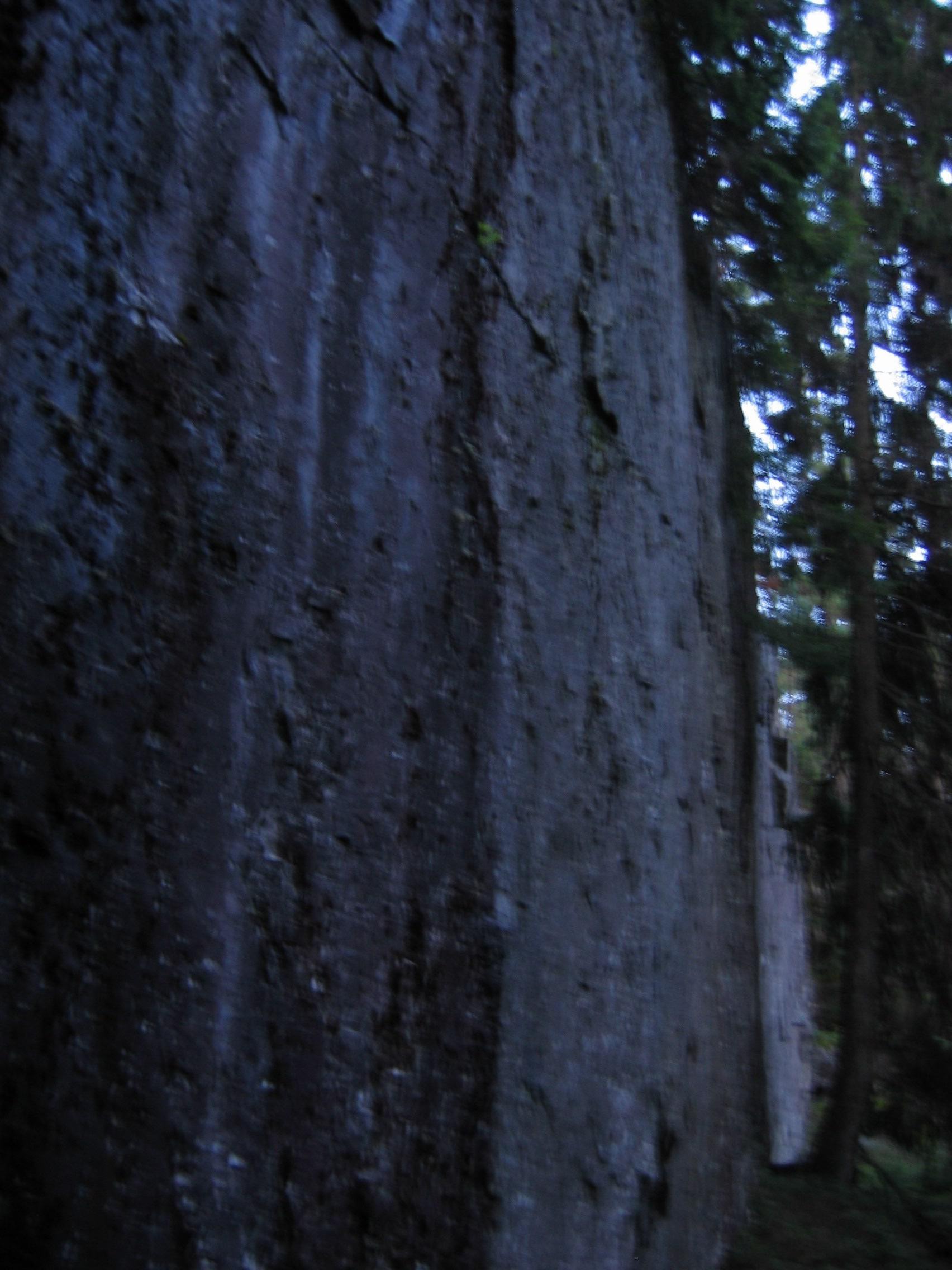 Hei! Dro opp igjen i kveld, men sent og uten mye naturlig lys. Dette bildet er tatt med dagslys etter ni om kvelden, så det slipper ganske mye dagslys inn i området. Ikke veldig skarpt, men du får inntrykk av at det er ganske høyt. Ingen tegn til menneskelig forsøk på å bearbeide for å klatre. Klippen er godt gjemt, selv om du kommer dit med 15-20 minutters gange fra parkeringen på Skar.