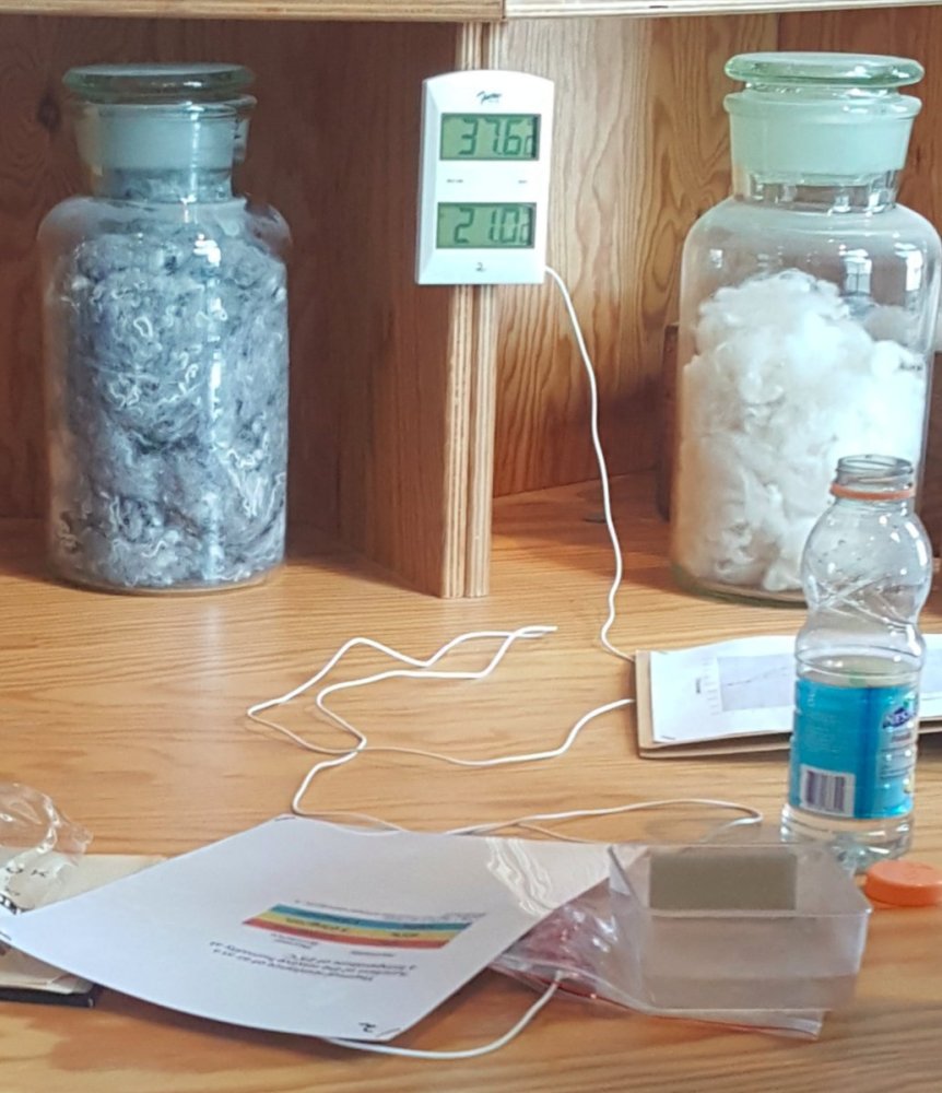 Bildet er fra Devold museumet i Langevågen, hvor omviseren ville bevise at våt ull blir varm. Rommet og ullen var i utgangspunktet 21 grader, ved å helle litt vann på ullen (som ligger i plastposen) så steg temepraturen. På bildet har den steget til 37.6 grader, det kan være at den økte litt til. Det er vel rimelig å anta at denne temperaturøkningen skjer kun i fasen fra tørr til våt ull.