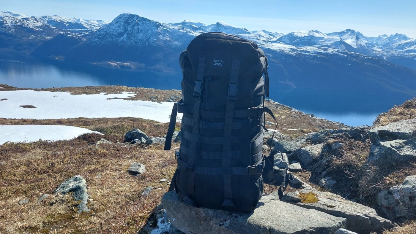 Jeg gikk til innkjøp av denne Savotta Jääkäri M, like før påske, hos Sisu Villmark, da de var en del billigere, men de juster prisen opp like etter. Jeg har lest meg til at jeg nå har PALS sekk eller en sekk med «PALS webbing», som da gjør det mulig å montere på «MOLLE» kompatible vesker eller annet utstyr. Jeg har allerede kjøpt meg MOLLE-lommer for montering på hoftebeltet, (kr. 45.- fra Overskuddsmateriell.no). Så får tiden vise om jeg trenger noe mer, men det er fint å muligheten. Sekken har nå vært i bruk, både med trimturopplasting på 20kg og som dagstursekk. Som nevnt tidligere i posten så er det minimalt med polstring både på skulderreimer og hoftebelte. Uten at dette, litt overraskende, har vært noe problem. Kan det virkelig gjøres så enkelt? Andre leverandører har nå til stadighet nye og, etter sigende, oppgraderte versjoner av sine bæresystem. Noe over 500 høydemeter med 20kg på ryggen og tunge fjellsko er, for meg, ikke behagelig på noen måte og det kan være at inntrykket av sekkens bærekomfort ikke er helt representativt. Men inntrykket så langt er at denne sekken blir å følge meg i lang tid fremover. Som ballasttank så har jeg brukt en 15l vannkanne fra Biltema. Denne tømmer jeg før jeg begynner på turen nedover. Det er en meget god følelse å rusle nedover med lett sekk og skånsomt for knærne er det forhåpentlig også.