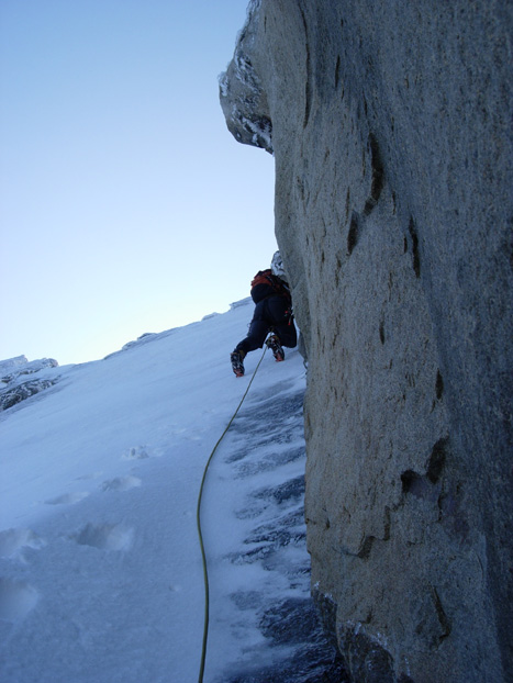 5. Vi gick turen i söndags och håller med att den var bra. Det var våra spår som du följde. Men som du skrev så var grad 3-klättringen vid utsteget svår, då det var snö uppe på svaet. Skönt att Tobias Granath som ledde är en stabil kille. Vi gick löpande med två säkringar på första klippartiet och sedan inknutna under snödelen (dubbla isyxor) utan säkringar och till sist en standplats och och en kil som mellansäkring på de sista 40 metrarna. När vi var där var det för isigt för att en friend skulle sitta säkert.