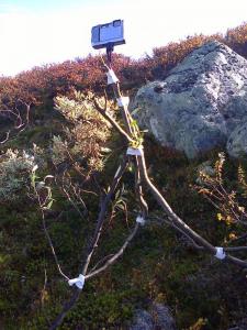 Mine tidligere bidrag i serien "Gjør det selv". 1. Utskilt fra Fiaskotur - lafe spade 2. Solid feste for GPS 3. Utskilt fra Fiaskotur - lage truger 4. Alternativ til fluevest - "fluesmekke". 5. Tommetrix nr 5 - "Fingerbøl". 6. Tommetrix nr 6 - Lett feltkjøkken 167 gram". 7. Tommetrix nr 7 - "Malingspannovn 896 gram". ############################################## 8. I dag Tommetrix nr 8 - "Vedbærer og fotostativ". Om jeg et øyeblikk skulle tro "at dette har bare jeg kommet på", så tror jeg ikke det. Tommetrix nr 8. På høyfjellet er det ofte langt mellom vedpinnene. Derfor når jeg nærmer meg stedet jeg vil legge campen begynner jeg å sanke ved. For å holde orden på veden og slippe og miste den underveis har jeg alltid med meg en liten snor (Bilde nr 1). I forrige uke var jeg på Hardangervidda og enten var det blikkstille eller rimelig sterk Nordvest vind. Derfor ble det lite fisking. I stedet besluttet jeg meg til å fotografere i stedet. Men denne gangen fant jeg ikke en passende stein til mitt lille fotostativ (Bilde nr 2). Med et trebenet stativ som modell kuttet jeg noen vierkvister og vha tape ble resultatet ganske brukbart. (Blide nr 3)