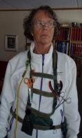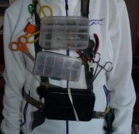 Fluevesten var moden for utskiftning, men hadde jeg lyst på en ny? Og svaret var egentlig nei, så hvorfor ikke lage noe som var lettere, billigere og mer funksjonell! Idegrunnlaget bygget på en oppblåsbar redningsvest. Materialer: Lastestropper (Biltema eller en syforening) Silkebånd (Syforening) Borrelås til å sy på (Syforening) Borrelås med lim /Biltema) Pin on reel eller heiskortsnelle (Staples eller sportsfiskeforretning) Splittringer (Sportsfiskeforretning) Låsespenne (Syforretning) Arbeidsbeskrivelse 1. Ta lastebåndet rundt halsen og klipp av i midjehøyde. 2. Sy på silkebåndet «rundt halsen». Hindrer irritasjon av bar hud 3. Klipp til tre tverrbånd, og sy disse fast. Pass på at det øverste ikke kommer for høyt opp, slik at du ikke får «fluesmekken» over hodet. 4. Sy på bånd nederst. Se på en redningsvest. Fest en låsespenne. Sy også på borrelås om du ønsker å feste en fiskeveske ol til den. Bare borrelås gir dårlig feste, så forsterk med et par sikkerhetsnåler. 5. Sy på borrelåser (myk del) der hvor du vil feste flue eller slukbokser 6. Lim fast borrelås på fluebokser eller slukbokser 7. Sy fast splittinger til feste for PoR. Til saks, fortomretter (en bit sykkelslange) fortomskutter, avbitertang osv 8. Sy fast et strikk på håvskaftet. I enden av strikken knyt fast en liten karabinkrok. Den festes på en splittring foran på midjebeltet. 9. Sy deretter en snor fast relativt høyt oppe på høyre siden av halsen. Tre snoren inn i håvringen og knyt en enkel knute i øvre tverrbånd. Når du skal bruke håven, trekk i snoren og håven er fri til bruk Husk å svi alle ender. Lykke til.