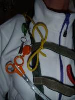 Jeg ville gjerne ha GPSen i front av jakka, og i stødig grep Sydde først en hempe til karabinkroken i fronten av jakka Sydde deretter en 5 cm bred borrelås, eller 2 smale, (myk) på jakka, under hempa. Tok så en gammel kikkertveske og limte/sydde borrelås bak. Glødet en spiker og laget noen hull i veska, slik at vann kan renne ut. Sydde tilslutt et strikk på tvers av veska, som holder GPSen på plass, også når jeg springer etter som en gal i ura etter sauen.
