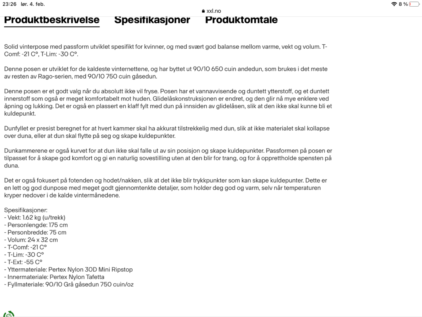 Der røyk jeg på ny sovepose, gitt.. takk for tips! Har klart meg uten ordentlig vinterpose helt til nå - på folkehøgskole var vi tre stk som slo sammen 2 tresesongsposer til én pose og lå sammen i skje, alt for å spare vekt og penger 😁 Ellers har jeg brukt en sommerpose utenpå en god tresesongspose. Med godt underlag og riktig bekledning har det funka bra selv nærmere 30minusgrader. Uansett forlokkende med én pose som tar mye mindre plass og veier mye mindre (selv om denne vel og må få hjelp av en pose til om det blir særlig mer enn 20 minus). -