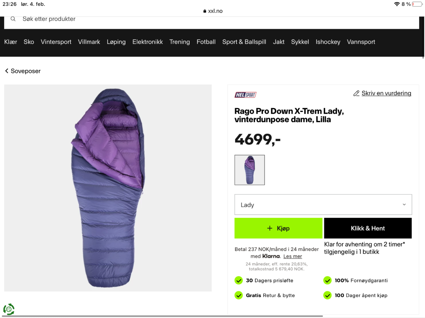 Først kjøpte jeg Helsport Rago Pro Down X-Trem (Unisex, 185cm) på supertilbudet til XXL som er denne uka (3200,-). Prøvelå i butikken, jeg kunne forsvinne helt i den. Håpa å kunne bytte den til damevarianten (175cm) som jo tross alt faktisk har lavere utsalgspris (7000,- mot 7300,- for Unisex), men det var jo litt vel optimistisk. De kunne ikke selge den like billig, for de solgte så få av den uansett og kunne dermed ikke kjøpe inn store partier. Tenkte å levere den tilbake, men kom på at en kollega (lengre enn meg) planla soveposekjøp. Hun fikk se og prøve den i dag og slo til. Og så dro jeg litt slukøra til XXL igjen og kjøpte damemodellen for 1300 kr mer enn Unisex - men fikk slått av 200kr på det de egentlig ville ta, da de har prisgaranti og Fjellsport selger posen for 4499,- nå. Litt surt å betale mer for kortere pose, men men. Mest av alt kjenner jeg på bismaken av å handle på XXL. Likevel trumfer gleden over å endelig, for første gang i et tross alt relativt langt og omfangsrikt friluftsliv, eie en ordentlig vintersovepose.
