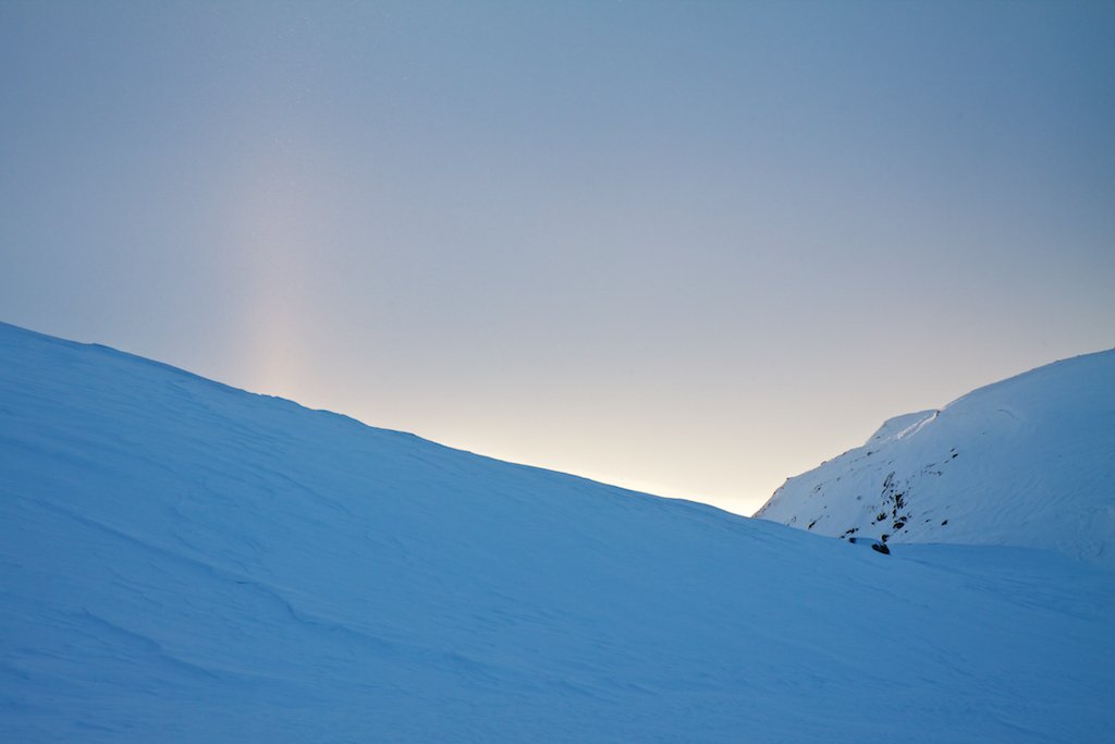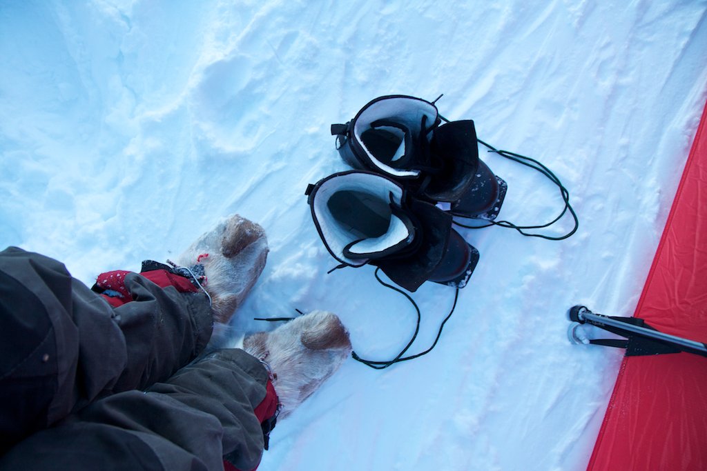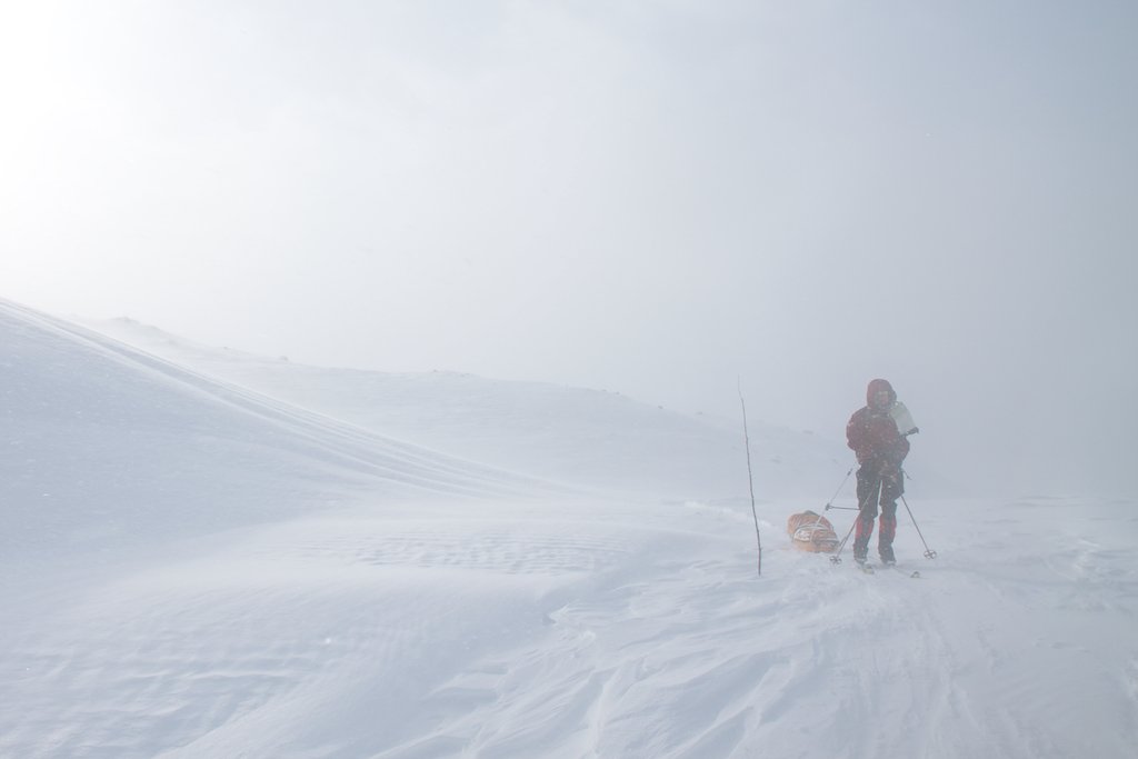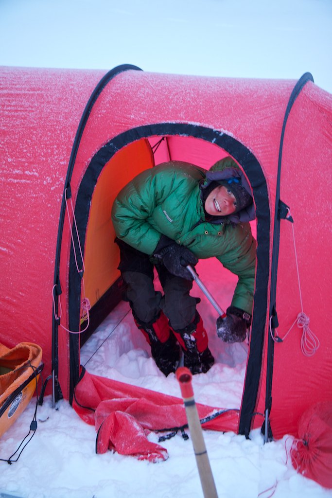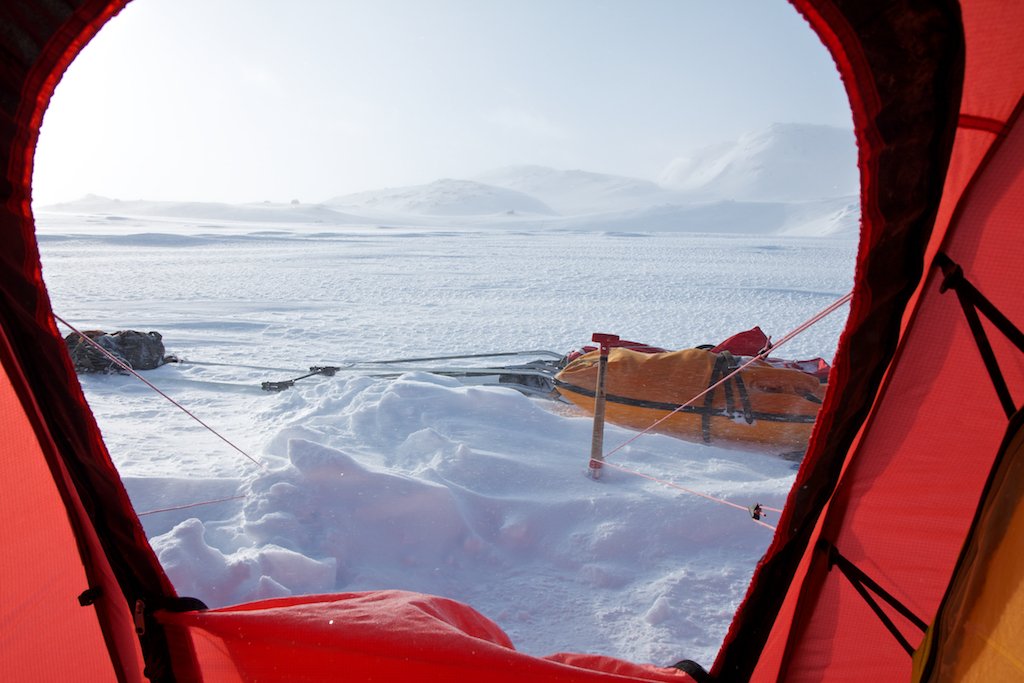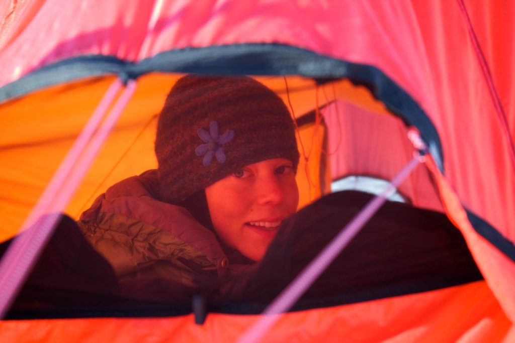 Vi hadde også "pressa ned"-effekten. Den ene natta satt jeg med ryggen opp mot teltstanga for å støtte mot vinden. Snedig effekt den Marius opplevde nå, at teltet ble løfta opp - tross at det var delvis gravd ned