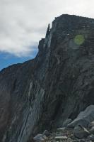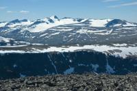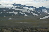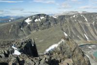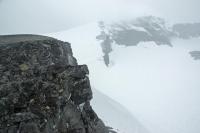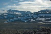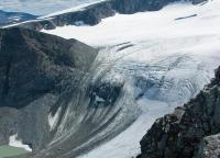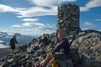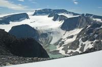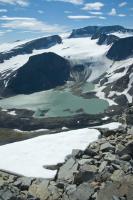 Jeg har længe ønsket at se nærmere på fjeldene "bag" Glittertind og i august fik jeg endelig gjort alvor af en tur her. Jeg ankommer parkeringspladsen i Veodalen ca. kl. 18 den 8. august og får pakket en tung sæk med telt og mad til 3 dage. Fint vejr. Der er ganske stor aktivitet med folk, som cykler op til Glitterheim herfra. Kommer først afsted kl. 19.30 og går først ca. 1½ km af vejen og derefter op til højre i hakket ved Bergenusshaugen og i retning mod Trollsteinkvolven. På vejen møder jeg en dansk kone, som fortæller, at hun sammen med manden har gået Trollsteineggi, og de er nu på vej tilbage til teltet ved parkeringspladsen. Manden samlede på 2000 metere og kommer derfor senere... Konen fortæller også om endnu en dansker, som ligger i telt i Trollsteinkvolven. Kl. 21.30 er det tid at slå teltet op, og jeg ser ikke noget til andre telte. I løbet af natten bliver det ganske koldt, og jeg må op to gange og tage ekstra tøj på. Og så ærgrer man sig over, at det blev sommersoveposen, som er med oppe, og ikke vinterposen, som nu lå i bilen. Næste dag er der lidt flere skyer, men pænt vejr, og jeg beslutter at gå op på Austre Glittertindoksle via Bukkeflye. På vej op møder jeg en sneræv! Vi står og betragter hinanden interesseret på 20 m afstand ca. 10 sek. Og så forsøger jeg forsigtigt at få kamera frem, men straks løber ræven. Men jeg når da at få taget et foto af den på vej over en snefane og væk. Det er muligvis eneste gang i livet, at jeg får en ræv at se i fjeldet. Husker én gang at have set jerv ikke langt fra Sognefjellshytta. På vej op kommer man forbi en NVE hytte. Her er madrasser lagt udenfor holdt fast af sten. Prøver forgæves at forstå den behandling af madrasserne. Tæt ved toppen ser jeg en mand på vej op samme vej. Det viser sig at være den anden dansker fra andet telt nede i Trollsteinkvolven. Men hans telt lå langt højere oppe ved Trollsteintjønne. Det begynder nu at sne og blive dårligere vejr. Man kan dog ane Glittertind og Trollsteineggi. Jeg checkede, om det er muligt at komme ned på nordsiden af toppen mod breen, men der synes at være for stejlt oppe langs æggen. Jeg vælger nu at gå ned og hente vintersoveposen (ekstra 4 timer) og fra ca. 2000 m højde gik jeg ned i den nordlige kant af Gråsubreen, som er snedækket. Min vurdering er, at der ikke er sprækker på den del af breen med stort press fra isen ind mod klipperne. Og længere nede går jeg syd for Gråsubekken ned til vejen. Jeg bliver ved bilen ca. 2 timer, mens det regnede en del og går herefter op til teltet i tørvejr. Denne nat sover jeg varmt og godt. Næste formiddag (10.august) regner det en del, og der var dårlig sigt, så jeg beslutter at vente. Kl. 13 stopper regnvejret, og det begynder at klare op. Så jeg vælger at gå en lille tur over på Smådalshøe og se ned i Smådalen. Der er fin udsigt her både til Glittertind og til Smådalen og nord for. Der er mange rener i det område. Det bliver helt fint vejr mod aften så aftensmaden er dejlig at få udendørs. Om morgen 11. august er det flot vejr, så det er dagen for den lange tur, og jeg kommer afsted ret tidligt - ca. kl. 6.30. Turen gik op ad ryggen på Trollsteinhøe og til Austre, Nordre og Søre Trollsteinhøe. Dernæst til Gråhøe ned Svarholsglupen og op Svartholshøe og Trollsteinrundhøe. På vej op Trollsteinrundhøe kommer man forbi en pinakkel - aner ikke, om den har primærfaktor over 10 m... Indtil nu er jeg kun stødt på danskere og en sneræv i området, men på Trollsteinrundhøe fik jeg endelig mødt nordmænd, en fader med sine to sønner - den ene kun 12 år, som var gået op gennem Trollsteinkvolven fra parkeringspladsen. Faderen havde gasapparat med og kunne byde på frisklavet varm kaffe - dejligt! Men han var ikke i stand til at motivere drengene til en videre tur ud på Trollsteineggi - klokken var blevet ca. 15.30. Jeg synes ikke, at jeg er helt frisk nok til at gå derud alene, for det vil blive sent før, at jeg er tilbage. Så det tilføjer mere risiko. Så jeg valgte også her at snu og gå via Svarholsglupen og ned til teltet. Så disse fine toppe må blive en anden gang. Men rigtig flot tur alligevel. Næste dag er søndag den 12. august, som er for hjemtur til København.