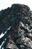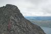 Jeg forsøgte mig 2. august at komme op her, men fandt ikke stedet at komme op og måtte snu. Faktisk havde jeg bare hørt, at det skulle være let at komme op. Jeg læser nu din kommentar her og undrer mig. Jeg mødte en hammer på æggen og forsøgte også at traversere til højre og faktisk helt om til et sted, hvor der var udsyn til Mitdre Torfinstind, og hvor 4 klatrere er på vej op, de var på vej fra vest mod øst. Jeg mødte dem senere næste dag på båden. Men jeg forsøgte flere steder at komme op, men synes, at det blev for udsat. Det er lige efter det sted, hvor du på et foto skriver, "På eggen ble det til litt klyving". Jeg vedlægger også et foto, hvor man ser lidt mere til højre, og hvor det lodrette stykke på æggen er markeret med en streg.