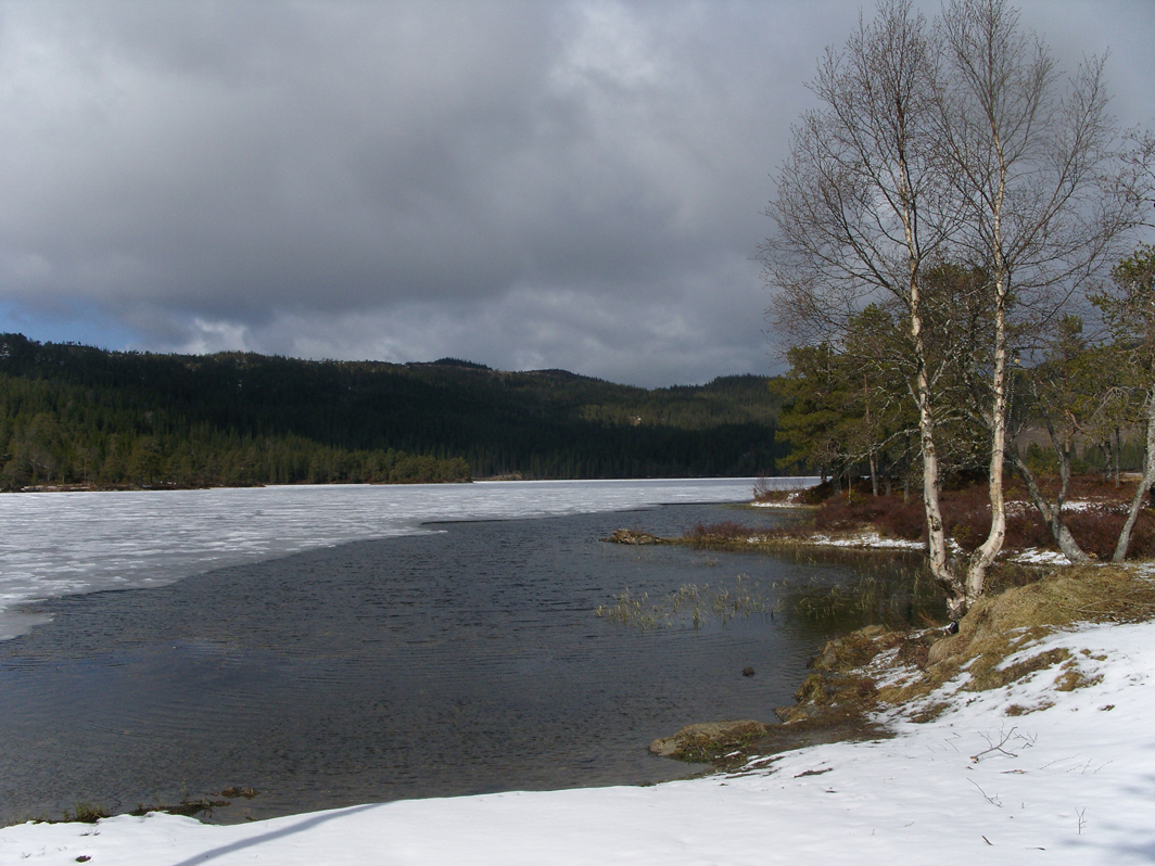 21. På ukjente stier.... Vi har tatt turen til Jervfjellet mange ganger, men idag tenkte vi å finne en annen vei til toppen, nemlig fra Saksvikvollen. Før har vi alltid gått fra veien mellom Jervan og Jervskogen skianlegg som går nord for Jervfjellet. Et tredje alternativ er å gå fra Mostadmarka/Rolset (skal testes ut til våren) Det var overskyet og fin temperatur og delvis snøsørpe, myk is og helt bar sti innimellom. Vi kom nesten halvveis tror jeg, da vi ble usikker på hvor vi skulle gå. Det ble etterhvert ganske dyp og råtten snø, så vi fant ut at vi skulle snu. Prøvde så en annen sti, eller fulgte iallfall fotsporene etter noen og kom opp på en kolle hvor vi fikk fin utsikt utover Jonsvannet og jammen så vi plutselig Jervfjellet også! Jaja, så vet vi det til en annen gang Vi hadde med kart, men stien var ikke inntegnet, så det hjalp ikke så mye. Men men, vi tok lunsj i myk mose og koset oss med kaffe, kakao og god mat. Vi tar turen om igjen når snø og is er borte og det er lettere å se hvor stien går. Vi hadde naturen helt for oss selv helt til vi var nesten tilbake til Saksvikvollen, da møtte vi to som lurte på om dette var rette veien til Jervfjellet Håper de fant frem til toppen! Fin tur selv om vi ikke kom til topps i dag, satser på bedre lykke neste gang... Lite is på Jonsvannet til å være tidlig i mars!