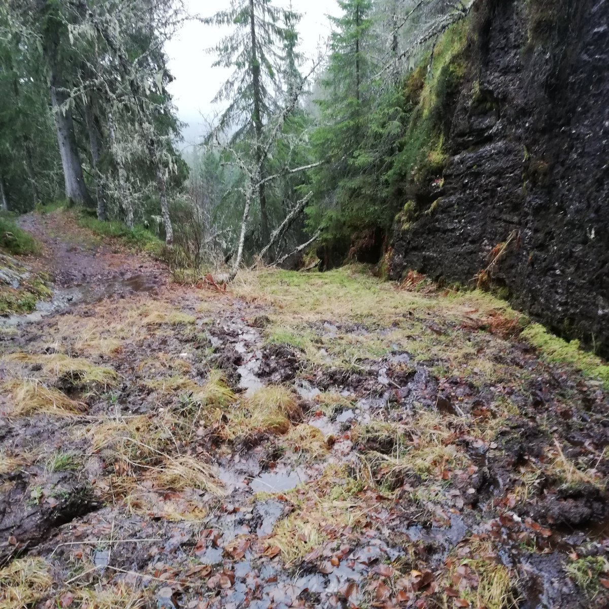 Noen som vet hvordan stien her er? Går det greit å følge den? Vi har aldri gått opp på Jervfjellet fra denne siden, vi har alltid gått fra veien mellom Jervan og Jervskogen skianlegg. Det gjorde vi forrige søndag også. Nå har vi lyst å gå en annen vei opp søndag siden det er meldt brukandes vær. Vi fikk heftige regnbyger forrige søndag, og utsikten var ikke den helt store. Vi droppet å gå helt til toppen, vi så den faktisk ikke heller i det kraftige regnet. Det har regnet dobbelt så mye som vanlig i oktober, så stien var veldig våt og gjørmete. Men på vei ned fant vi alternativ sti rundt de verste partiene, så nedturen gikk veldig bra. Det er jo veldig bratt, men vanligvis er det flott å gå både opp og ned her. parti av stien ned