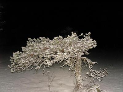Vi var ute på glattisen i kveldsmørke Husbonden gikk overende, men det gikk bra, ingen brukne bein. Kun et solid blått merke. Det har kommet et lite snølag som dekker den skumle isen på myrene, så vi listet oss på tå. Jeg tok på brodder halvveis, heldigvis lå et par i sekken så husbond også fikk brodder på til hjemveien. En smal, smal måneskalk klarte ikke å lyse opp noe særlig, men med en hodelykt og en vanlig lykt hadde vi lys så det holdt. Veldig pent i skogen med nysnø på trærne i mørket. Vi tråkket nye spor til Dreiers Minne, litt utenom verste isen. Men om du skal dit, så ta på brodder!