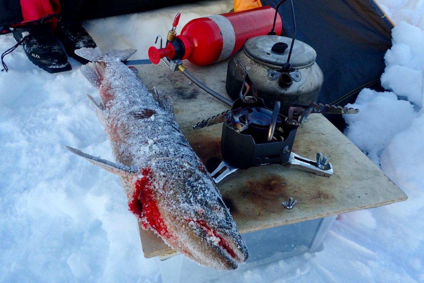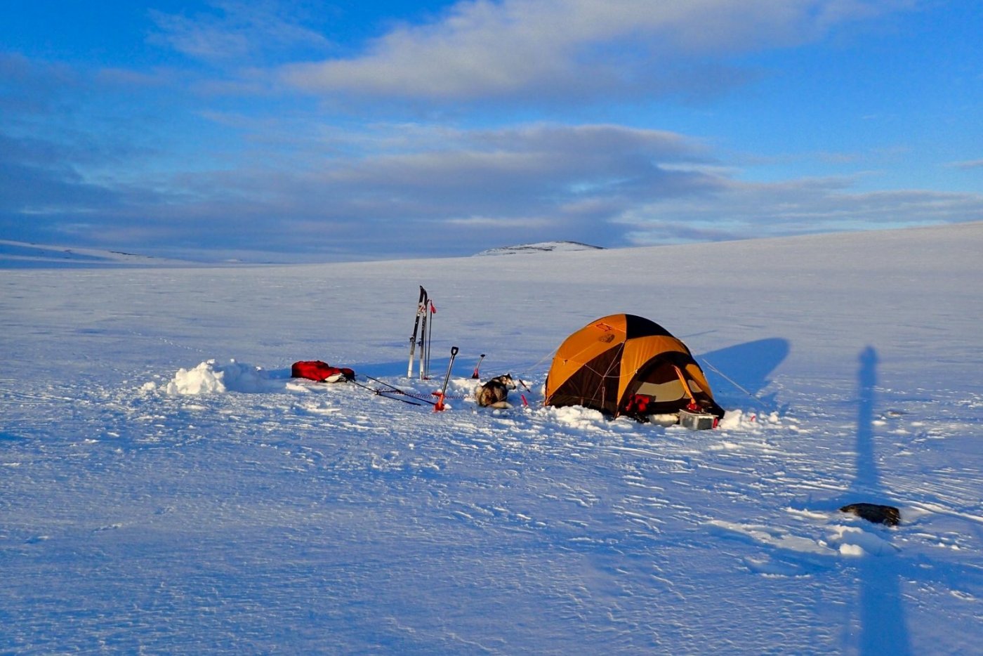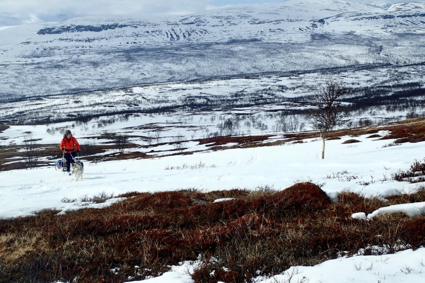 Tilbake fra 5 dager i indre Troms. Tungt gjennomslagsføre og lite snø under tregrensa (både ski og pulk har blitt noen riper rikere) men flott i høyden. Bikkja på ni mnd fikk kjørt seg i sukkersnøen, men imponerer stadig med sin arbeidsinnsats. Neste vinter blir bra når hun kan trekke pulk fullt ut med eget drag. Enn så lenge går det i snørekjøring. Nok en gang er det finfiske med Mormyskha som må til for å lure storørreten.