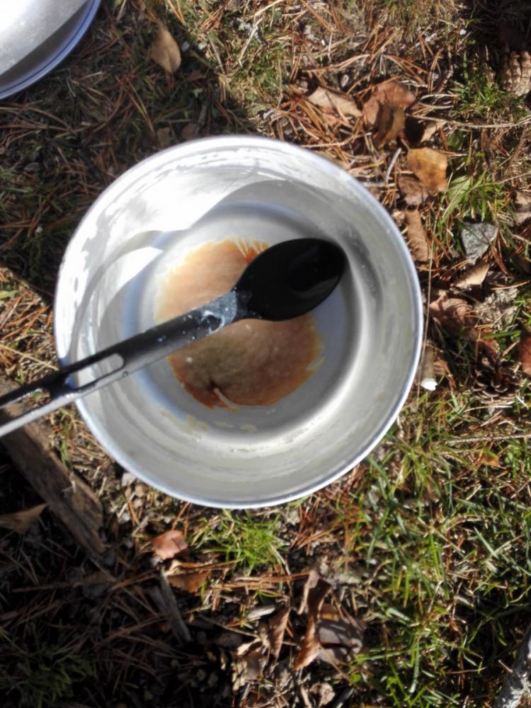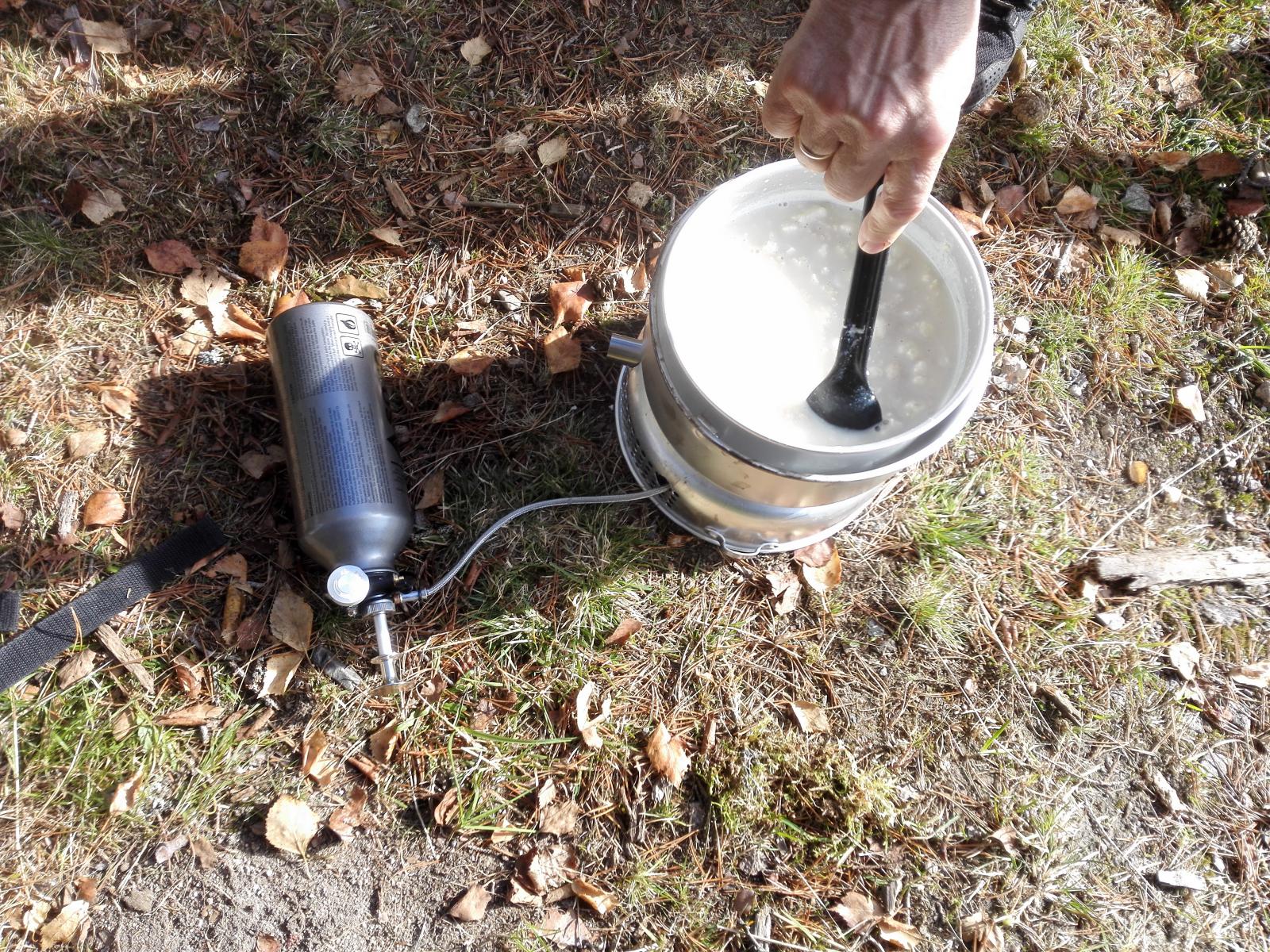 12. Nå har jeg hatt Soto Muka på et par test turer, og dette blir ikke favoritten min. Vindskjermen som følger med er om ikke ubrukelig, så i hvertfall alt for dårlig, så da blir det jo bare å trosse bruksanvisningen og montere den inn i en Trangiaklone. Ja det ble det andre boller, eller i det minste dagen suppe. Aldri har jeg kokt suppe så fort, litt vanskelig å simre nok, men akseptabelt. Det ble litt brunt i bunnen av aluminiumskjelen. Dette er en helt rå vannkoke og snøsmelte primus, jeg er virkelig imponert over pumpa med ventiler som gjør det kjempelett å starte prosessen, OK og regulere, og grei måte å tømme flaska for luft. (trykk). Vurderer av likevel å prøve å selge den, og fortsette med min 20 år gamle Coleman apex ii med en beskjeden makseffekt på 2kW og simremulighet ned til nesten ikkeno. Blomkålsuppa var en nytelse, og det ble ingen usmak som følge av det brune i bunnen av kjelen. dsk