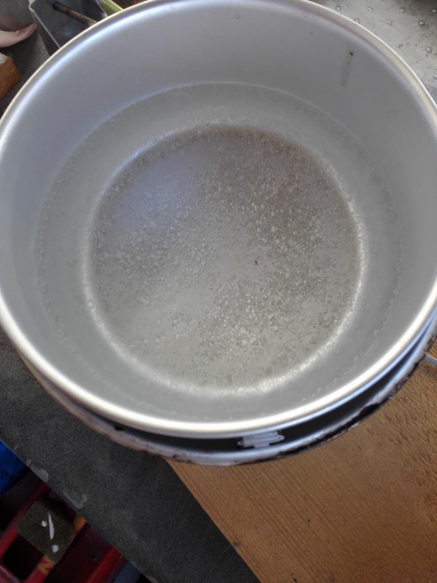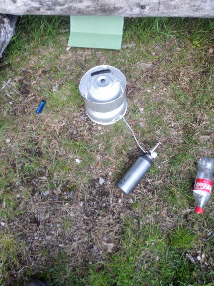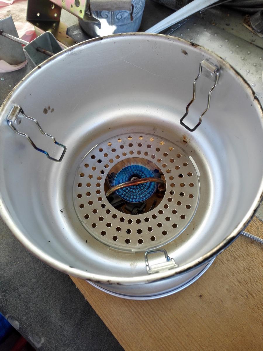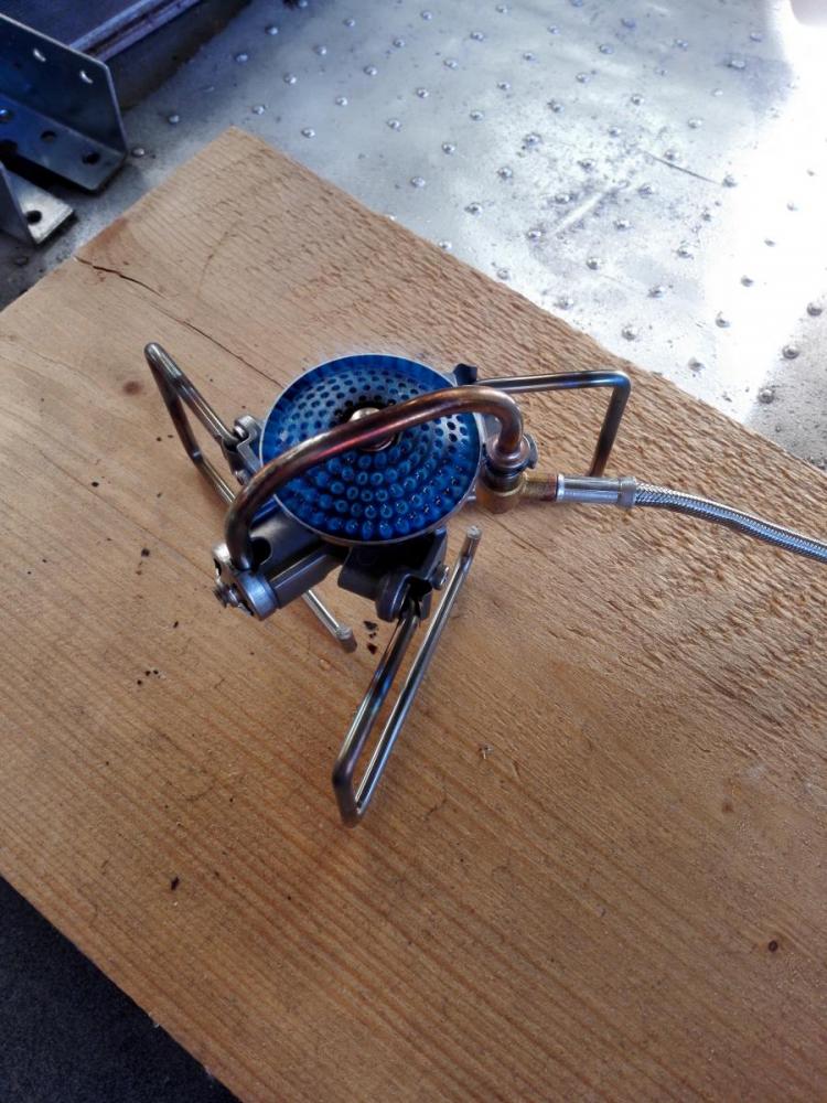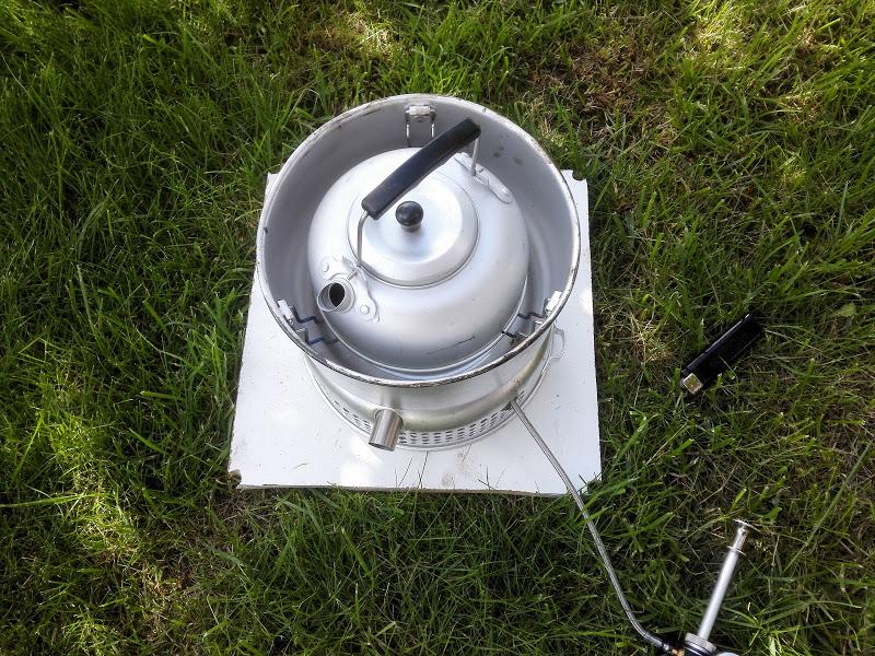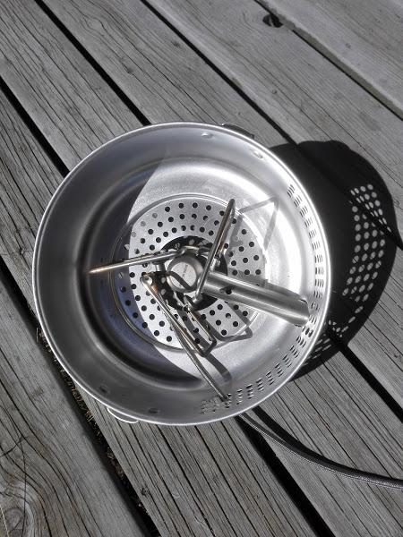 Jeg vikk en ide, men det kan hende at noe aluminium blir borte her også: Biltemas: Trangiaklone kan ofres, men holder brenneren? Med bena halveis utslått så passer dette ganske bra uten ytterligere modifisering. Treplata under ble ikke misfarget på oppkok av litt vann. -