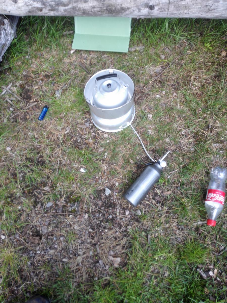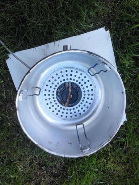 O2 maximizer'en gir merkbart bedre effekt. Med oppsettet i Tragiakopien kokte jeg 1/2 liter på under 2 minutter! uten O2 maximizer'en. Et av bildene viser brenneren opp ned i vindskjermen, her kan den faktisk "stripses fast med et par metalltråder, men jeg tror det er unødvendig. Hull til slange, og optimizer blir step 2 i prosjektet. Tror dette kan bli bra for varming av vann, litt usikker på om ting vil brenne fast i midten, men den "simrer" ganske bra i vindstille. dsk -