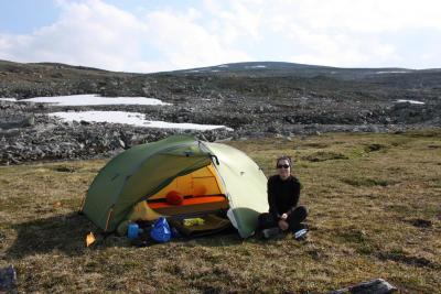 10. Eg har Exped Venus II, og er veldig nøgd med det. Dersom du skal bruke det åleine er det god plass - bagasje inne i teltet eller eine forteltet og matlaging i det andre forteltet. For meg (172cm høg) er det god sittehøgde. Ein stor fordel med dette teltet er at det går an å rulle til side heile forteltet på båe sider, og ha det som ein tunnell med berre tak (litt dårleg forklart...) På biletet nedanfor er halve forteltet rulla til side. Når det gjeld kor sjølvståande det er, så er eg litt meir delt. Det er ikkje noko problem å bruke det med berre 4 pluggar (ein i kvart hjørne), men for å få dratt ut fortelta er det behov for 2 pluggar til (1 i spissen av kvart fortelt). Eg tykkjer det er vanskeleg å få satt opp teltet skikkeleg dersom eg ikkje får godt feste til desse 4/6 pluggane, det er ingenting som tvinger hjørna frå kvarandre, om du skjønner kva eg meiner. For å få stramma det opp i litt blautt vêr er det behov for minst 4 bardunar i tillegg, i alle fall tykkjer eg at ytterduken heng innpå innerteltet utan bardunbruk.