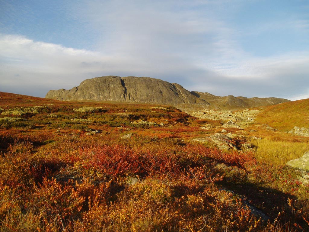 Det var lørdag, og vi var på hytta for å rydde litt før vinteren. Båten skulle opp fra vannet, og litt material etter sommerens byggeaktiviteter skulle stables i hus. Dette gikk fort og greit, så da ble det tid for fjelltur utpå ettermiddagen. Det var sol, men vinden fra vest var så kald og sterk at det ikke fristet med langtur. Jeg forlot hytta og la i vei mot Ulvehaugsnosi. Turen opp dit er en sånn passelig tur som kan gås uansett vær og føre. Har vært der på alle tider av året, og på sommerføre tar turen til topps under en time. Denne dagen var det fint sommerføre hele veien. Høstfargene var på plass, men lufta var ikke så skarp og kald som forventet. Jeg nærmet meg det brattere partiet, og plutselig føltes det som om fjellsiden ble levende! Ryper i søkk og kav fløy opp fra seljekrattet, 3-4 stykker i slengen. Sånn fortsatte det i flere sekunder, og jeg talte til ca. 30. Hadde jeg vært jeger nå, så hadde jeg vært heldig... Vurderte å ta jegerprøven da, ja.. Jeg fortsatte oppover, og i løpet av turen så jeg flere rypekull i området. Sikkert en god sommer for fuglene i år. Jeg kom meg opp til varden på Ulvehaugsnosi og skrev meg inn i boka der. Sola var fortsatt klar og fin, og vinden hadde løyet litt. Jeg måtte gå lengre enn dette, kunne ikke returnere allerede nå. Sendte en tekstmelding ned til hytta før jeg fortsatte bakover mot Svartetjørni og Kluftnosi. Ned mot Svartetjørni er det lett terreng, med fine gressbakker. Nede i vannkanten ligger det en liten jaktbu, en trekasse tekket med asfaltpapp og innpakket i steinmurer. Låsen var brutt opp, så jeg tenkte jeg kunne ta en titt. Men døren var sperret med en stor stein, så jeg lot være. Sikkert ikke så mye å se på likevel. Jeg fortsatte bakover, mot Kluftnosi, dagens mål. Derfra går det an å gå litt tilbake, over et band og ned mot Ulvehaugen. Jeg ble stående å studere resten av dalen vestover... I forlengelsen av Kluftnosi ligger Eikishornane, en svart hammer jeg har kikket på i 10 år ellerno. Den ligger litt avsides i forhold til der vi normalt går på tur. Midt i dalen lå det også en liten topp med varde på. Fristelsen ble for stor. Jeg droppet Kluftnosi og satte kursen mot den lille toppen midt i dalen. Dette var en kjekk liten sak med god utsikt over høstfjellet. Så gikk ferden videre mot Eikishornane, det så ikke så langt ut... Opp mot høyre litt vest for Kluftnosi, og etterhvert opp på ryggen der. Noen flotte klyvehamre der, og jeg måtte selvsagt prøve meg på dem... Flotte ruter med gode tak, trolig grad 2-3 om man sammenligner med Jotunklyving. Litt høyt ned for enkelte, men det går an å gå rundt. Så ble det en del opp og ned, hit og dit, frem og tilbake... Det var flere fjellrygger og små daler bortover, men likevel lett terreng. Og det var mye lengre enn jeg hadde tenkt. Nærmet meg nå. Flere fjellrygger, og jeg trodde jeg var oppe. Da dukket det opp enda en topp et stykke lengre unna, og der stod toppvarden. Der borte løp også Mikkel Rev avgåde, rød og fin med hvit haletipp. Og han jaget opp 3 ryper før han oppdaget meg, men så var han borte... Dagens andre store dyreopplevelse Jeg ruslet bort den siste fjellryggen til toppvarden. Trig-punkt like ved, der masta hadde blåst ned. Skal ikke kartverket ta seg en runde og rydde opp snart..? Mye streng og skrot etter dem i fjellet. Jeg nøt utsikten en stund før retur. Ikke så mye vind nå, og sola begynte å bli skikkelig gul. Det var langt tilbake til hytta, men jeg fikk en god idé. Sendte en tekstmelding og ba om skyss fra Galdestølen. Da kunne jeg bare legge kursen rett nedover lia her, i stedet for å gå 3-4 timer tilbake samme vei. Litt "juks", men det gjorde ikke noe. Jeg ruslet nedover grønne lier, myrer og kratt. Utrolige høstfarger der, så det ble en del bildepauser. Fant meg en geitesti nedover langs elva, og snart så jeg rv.52 under meg. Og der nede stod allerede en audi og ventet. En grei avslutning på en deilig fjelltur