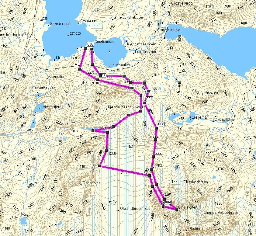 Håper du fikk en fin tur på Oksskolten. Gikk solo opp i vinter og kryssa breen et par ganger . Såg bare sprekker i brefallet noen hundre meter over tunga. Tunga under brefallet var såpass slak at du her kunne sikkert krysset uten sikringsutstyr. Det hadde sikkert ikke vært store omveien og gått fra Kjennvasshytta og runda nedsida av bretunga før videre oppstigning. -