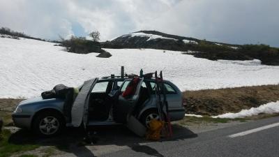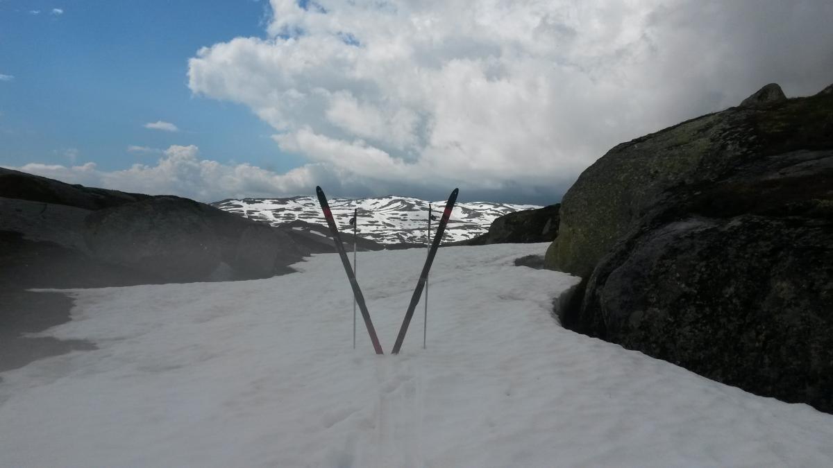 For det første. Det finnes neppe bedre turområde for sommerskitur en Setesdal Vest på denne tiden. Når man blir mer og mer som reinen med årene og tiltrekkes av snøen for å slippe unna innsekter og varme passer det perfekt. Området Suleskard -Kvinen ble utforsket. YR traff godt før pinsen med sol og vindstille i fjellet og tiltykning utover i uka. Etter dager med finvær skydde det på en time før mål og den første bøya kom da jeg så bilen. Snakke om tur og flaks. Teltet ble parkert hjemme så 12 kilo på ryggen var behagligt. Man sover bra under stjernehimmelen og stor måne. Kortfeller under skia muliggjorde passasjer over bart terreng. Ellers varierte nok snødybda fra null til 5 meter så en ny tur over st.hans er nok mulig. Nei nå får en nok hive sakene inn i kjerra og komme hjem til middag som lovet. Real turmat blir en forbannet lei av... Farvel til herligheten. Snart framme og de første skyene dukker opp. Tørk av den værste svetten før kjøreturen.