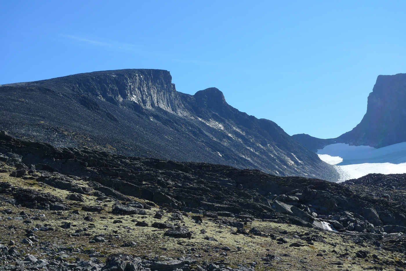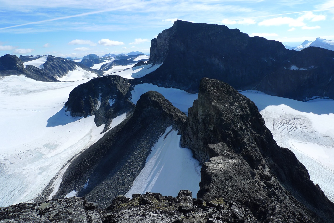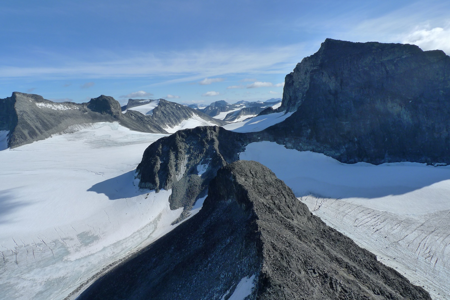 Jeg møtte Øyvind Mathiassen på Leirvassbu 18-19. september 2009, som fortalte meg om den “nye” toppen Killingen som var oppdaget nedenfor ryggen mellom Geite og Sokse. Etter å ha lest diverse spennende turrapporter på Fjellforum, bl.a. av Mayhassen og askogvoll (I ettertid også av 500fjell), hadde jeg fått veldig lyst på å få med meg Geita og toppene vestover mot Sokse. Sokse hovedtopp og Nordklo var jeg på 31. mai 2009 – en flott vintertur med Krossbu som utgangspunkt. GEITE (2002 moh) GPS: 4.55420 68.25892. 27. august 2010. Start fra Leirvassbu etter frokost. Vi kjørte ca. 2 km nedover til stor parkeringsplass, og fulgte deretter stien som nå brukes av fjellførerne fra Leirvassbu over Bjørnebreen til Storebjørn og Krossbu. Stien går rett vestover til greit tilrettelagt elvekryssing over elven fra Leirvatnet og videre bortover til Tverrbyttbekken som også var grei å krysse. Der tok vi av fra stien og gikk i NV retning rett opp til sadelen mellom Rundhøe (1816) og Geite (2002). Lettskyet fint vær. Videre greit opp til toppen av Geita i steinur, noen steder med lett klyveklatring. Flott varde på toppen. Nydelig utsikt mot Smørstabbtindane, Storebjørn og Stetind. Med på turen var våre gode turvenner Susanne Daae-Quale og Pål Hadler. Susanne, Pål og Astrid satt en god stund og nøt finværet på toppen for deretter å returnere samme vei som vi gikk opp. Vi brukte ca. 3 timer opp og 2.5 t ned. Jeg fortsatte videre bortover østeggen mot Sokse Ø1. Det var ikke aktuelt for meg å gå rett ned det bratte stupet på vestsiden av på toppen av Geite. Jeg gikk derfor litt tilbake og deretter nedover i uren på nordsiden av ryggen (ned mot Storbrean), hvor det var greit å gå. Kom etterhvert frem til den bratte hammeren som beskrives I Norges Fjelltopper over 2000m, og i mange turrapporter. Søkte ut mot venstre foran hammeren, og fant en skrå og ikke alt for bratt vegg med diverse sprekker som ga nok feste til at jeg kom meg greit opp uten bruk av sikringsmidler. Fant ved hjelp av litt leting også en grei trase videre opp til toppen av denne delen av østeggen. Det var lite spor etter andre, og ingen varder. Jeg ikke hadde særlig lyst til å gå tilbake ned igjen denne hammeren, og bestemte meg derfor for heller å gå ned fra Killingen. Fikk gitt beskjed om dette med en SMS til resten av turfølget (dårlig mobildekning). Passerte Killingen på vei bortover mot Sokse Ø1. Deretter grei vandring videre vestover på ryggen, delvis på fjell og delvis på nysnø, med flott utsikt nedover på begge sider av eggen til: SOKSE Ø1 (2092 moh, PF 11m) GPS: 4.54328 68.25641 Oppe der kl. 1420. Liten varde på toppen. Flott utsikt bortover den skarpe eggen videre mot Sokse og bortover østeggen mot Leirvassbu. Gikk tilbake østover eggen til jeg begynte å nærme meg Killingen. Bratte sva de fleste steder bortover langs ryggen. En liten stein lagt oppå en annen markerte en mulig nedgang (GPS Ø/V koordinat ca. 4.54650). Her var det en bratt, V-formet renne nedover med støvletak på begge sider. Videre nedover i meget bratt og løst terreng mot foten av Killingen. Kom ned et stykke vest for foten, og fant en horisontal sprekkdannelse på et sva som førte bort til foten av selve Killingen. KILLINGEN (2015 moh, PF 10m GPS 4.54683 68.25614) Killingen så imponerende og veldig ut der jeg sto ved foten av klippen! Fant en trase mot toppen på østsiden av nordryggen opp til et par meter under toppen. Siste stykket aket jeg meg på bryst og mage opp til den lille varden. Klokken var blitt 1500. Returnerte ned iigjen samme vei, bortsett fra nedre del da jeg valgte å traversere ut på nordryggen ved hjelp av en kort “armgang” på en steinkant som passet fint til formålet. Derfra lett ned til foten. Gikk så videre nedover helt inntil fjellet på østsiden av Killingen. Her var det meget bratt med masse løs grus og småstein. Utløste fllere mindre utglidninger av masser, men ingenting stort. Unngikk snøflaten som var meget bratt og glatt. Kom etterhvert ned på fast grunn, men fortsatt var det mye bratte sva. Valgte ut fra terrengvurdering å gå ned omtrent rett sørover mot NØ-siden av Bjørnbreen. Fulgte kanten av denne til jeg møtte sporene etter brefølget som hadde gått til Storebjørn samme dag Flott tur hjemover i nydelig vær med utsikt over det grønnblå Tverrbyttjønne, Stetind, Bjørnbreen og Storebjørn. Tilbake ved bilen ca. kl 1730. En spennende og flott tur! Godt med kald pils og påfølgende herlig middag hos alltid like hyggelig vertskap på Leirvassbu om kvelden!