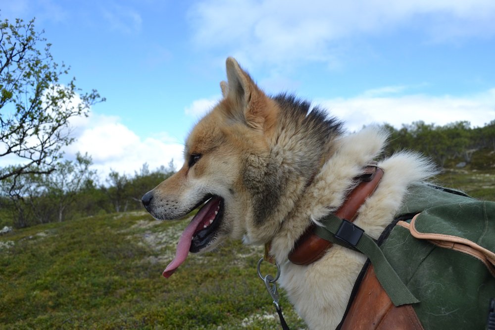 Ja, jeg er helt sikker på at kløven ikke skal snus! For det første så skal alltid den dypeste delen av kløvsekkene være fremst på hunden. Dette for å hjelpe til med å få den tyngste del av vekten frem og over skuldrene på hunden. For det andre er det i fremkant av kløvvesken at slitasjen er størst, og også der skinnforsterkninger har sin nytte. Det er også i den enden jeg har plassert frem at produsenten har montert brystreimen, og montert hanefoten i andre enden. Jeg synes ikke det er lurt å plassere kløven lengre bak på hunden. Om mulig ville jeg heller hatt den enda noen cm lengre frem. Årsaken til plasseringen er å få vekten mest mulig på skuldrene, og ikke på ryggen. Skuldrene og frambeina tåler belastningen bra, ryggen gjør det ikke. Det første bildet jeg la ut er litt misvisende. Hunden står litt bredt med frambeina, så derfor ser det ut som om kløvvesken går helt inntil, noe de ikke gjør. For at kløven ikke skal komme i konflikt med frambeina er det på denne kløven en egen reim under lokket som går fra ytterkanten på den ene kløvvesken til ytterkanten på den andre. Denne reimen strammes for å trekke toppen av kløvveskene mot hverandre øverst, som da igjen gjør at bunnen av veskene spennes ut fra siden på hunden. De kommer dermed ikke i konflikt med hundens frambein og ikke skaper gnagsår på eks albuene. Togo-kløven er en av de best utformede kløvene som er på markedet i dag. Og da tenker jeg verdensmarkedet. Den har god utforming, enkle, gjennomprøvde detaljer og den er bunnsolid i utførelse. Den komfortabel og stabil for hunden å gå med. En del av de andre kløvene på markedet, særlig en del utenlandske, har feil utforming. De har gjerne for grunne kløvvesker slik at vekten kommer for høyt på hundens kropp, og de plasserer ofte vekten alt for langt bak på ryggen. Her er samme type kløv sett forfra. Her ser man litt bedre at kløvveskene er spent litt ut så de ikke ligger inntil frambeina på hunden.
