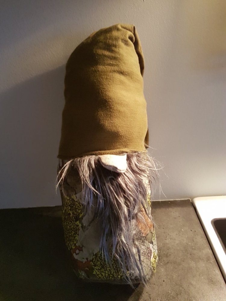 Før bestillingen med stoff kom fra Tyskland øvde jeg litt med nisser, som sagt. Her er en av de - jegernissen. Kropp i jervenstoff, resten av stoffet er stort sett rester fra andre prosjekter. Stjal ei sofapute for å bruke fyllet. Ikke akkurat friluftsutstyr, men relevant nok?