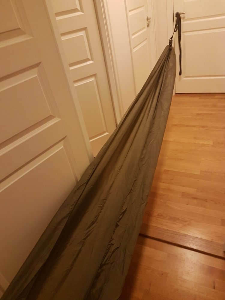Blir så tidlig mørkt nå om dagene, så foreløpig har jeg bare innendørs bilde av køya. Skal nok komme med flere bilder når jeg får prøvd den ute i dagslys. Vekt ferdig hengekøye med stropper og karabiner. Til info ble den 60 gram lettere enn TTM singel-køya. Vekt hengekøye pluss opphengsstroppene fra ticket to the moon-køya. Skal sy meg noen egne når jeg får tid. Foreløpig ingen fare for at noen her i huset blir med på vintertur med køye, så jeg trenger bare et sett enn så lenge. Det var det, foreløpig. Har flere prosjekter på gang, og mange i planleggingsfasen. Men kjøpte en del forskjellig fra extremtextil, så har mye forskjellig stoff igjen. Må bare finne tid til å sette meg ned.