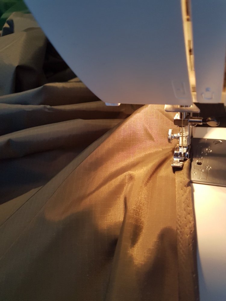 Så var det hengekøye. Motivasjonen for å lage denne var flere - men hengekøye er jo gaanske digg å ligge i. Jeg har fra før en Ticket to the moon single som jeg er ganske fornøyd med. Kanskje litt kort innser jeg etter at jeg lagde denne. I tillegg er det jo et ganske enkelt prosjekt i og med at det er en såkalt "gathered-end" hengekøye. Så god trening for nybegynnere dette også. Er tross alt begrenset hvor mange grønne pakkposer på 45*70 cm jeg trenger. Bestilte 4 meter med olivenfarget ripstop-nylon fra extremtextil. 70 denier og 66g/m2. Ganske lett stoff - og førsteinntrykket er at det er behagelig å ligge i. Holdt nesten på å gå på en smell når jeg bestilte stoff. Hadde silikonbelagt nylon i handlekurven, men det er fy fy til køye da det ikke puster noe særlig (i det hele tatt?) og blir klamt.. Flaks at jeg hadde is i magen og sjekka litt, for en gangs skyld. Stoffet jeg kjøpte heter til og med hammock-nylon, så det her må jo være bankers.