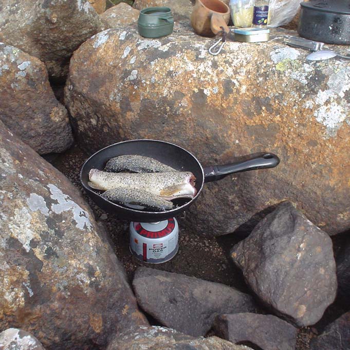 Små toppmonterte gassbrenner fungerer bra så lenge en har mulighet for å bruke steiner eller lignende for stabilitet (se bildet der crux er brukt med stor stekepanne). Uten blir det ustabilt med store gryter og panner (må holde, eller være påpasselig med vektfordeling). Mest stabilt med lav gassboks (240g bokser) og underlag av stein eller sand. Har crux og Kovea Supa light. Kovea brenneren er litt breiere og mer stabil, men flammen blir mer konsentrert. Vekten omtrent den samme. -