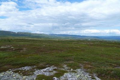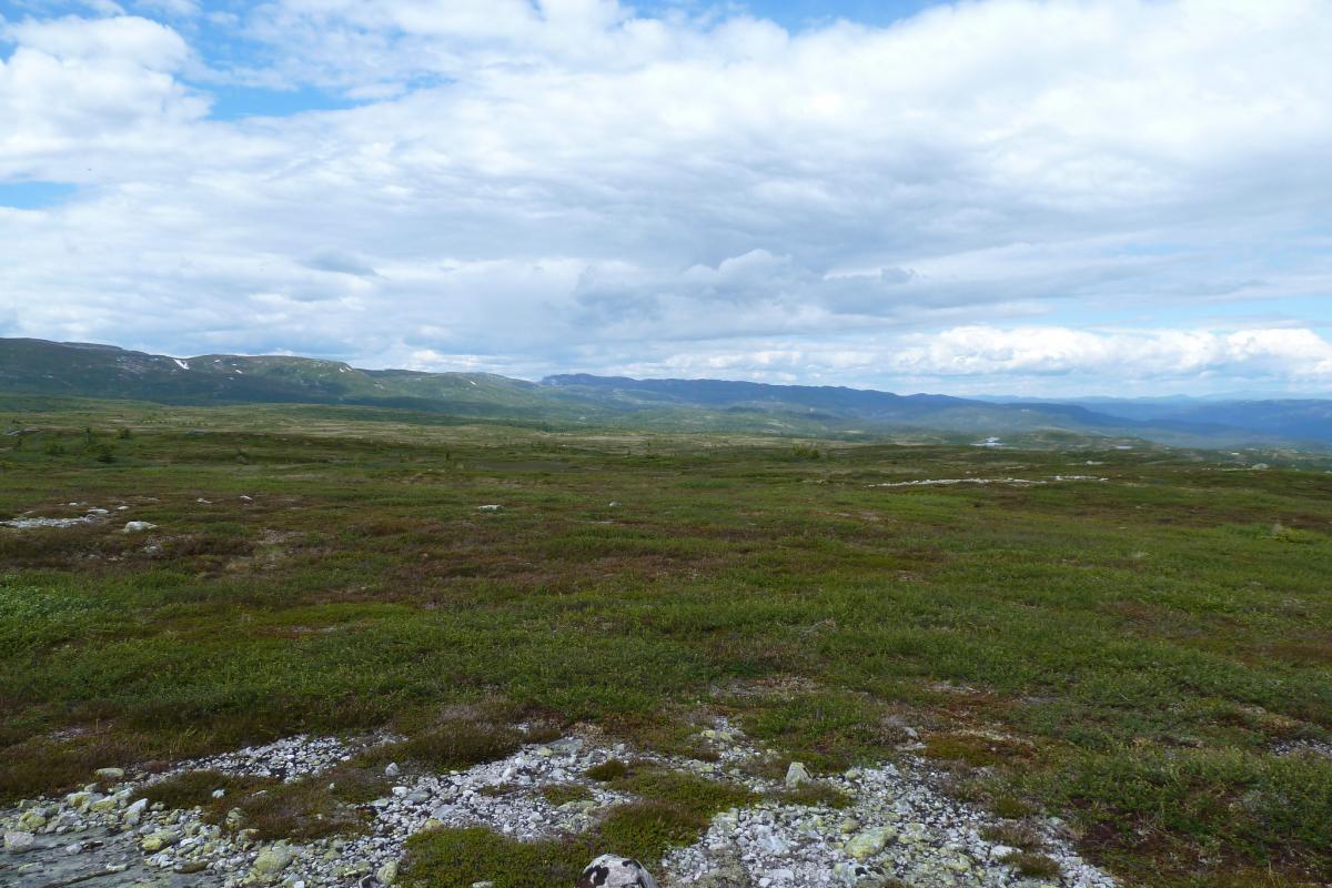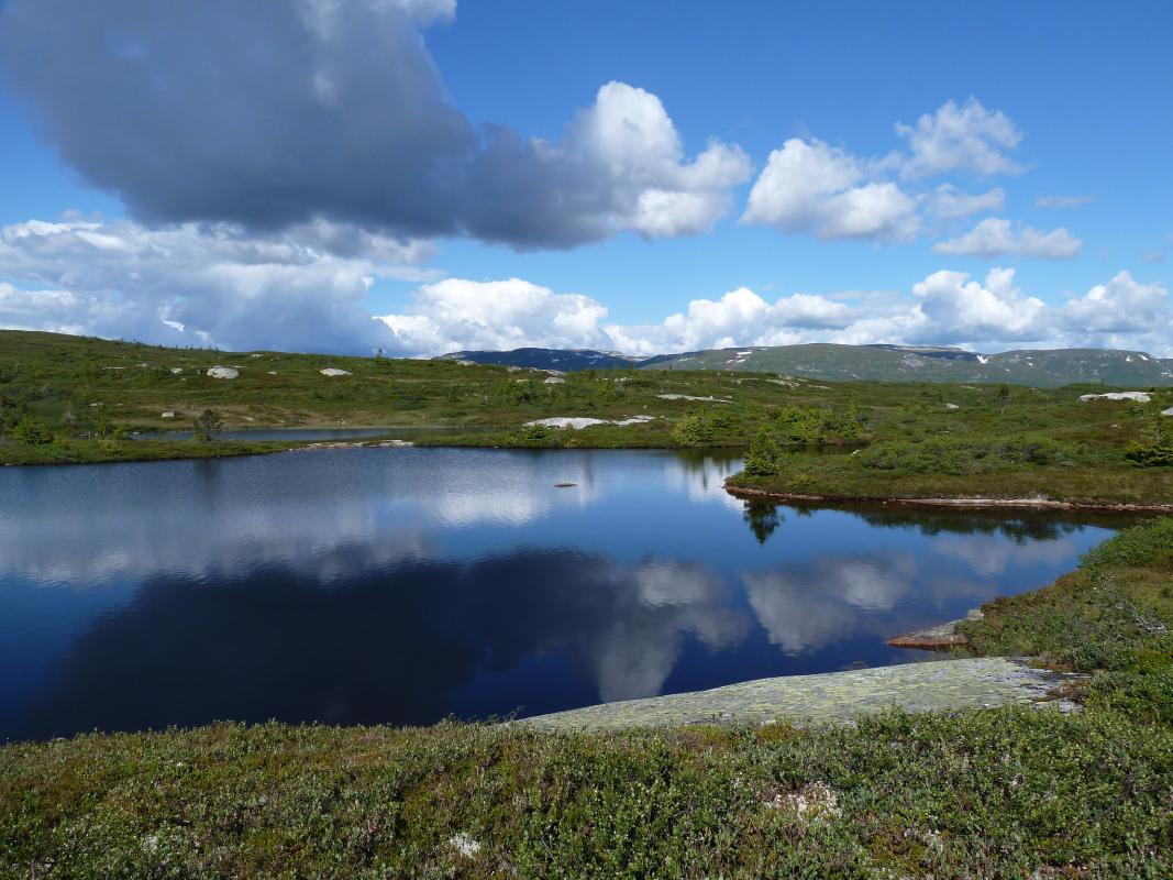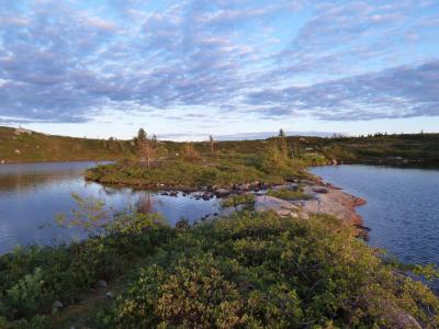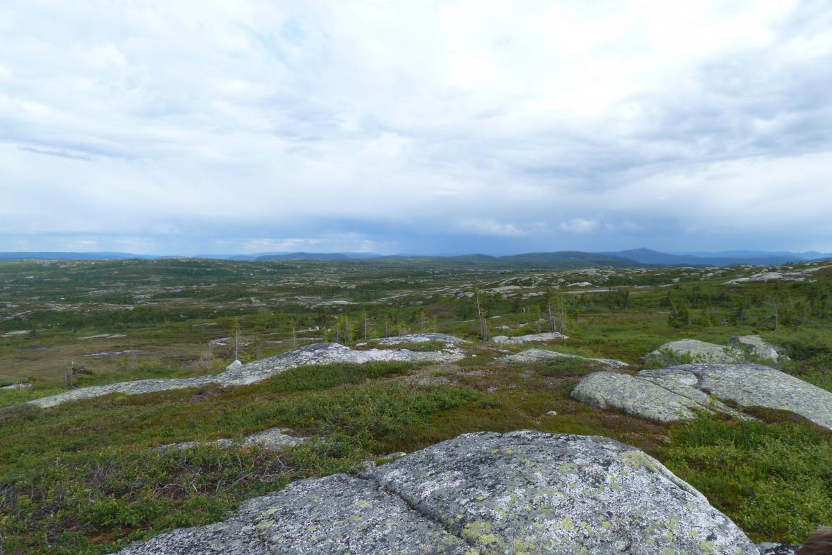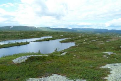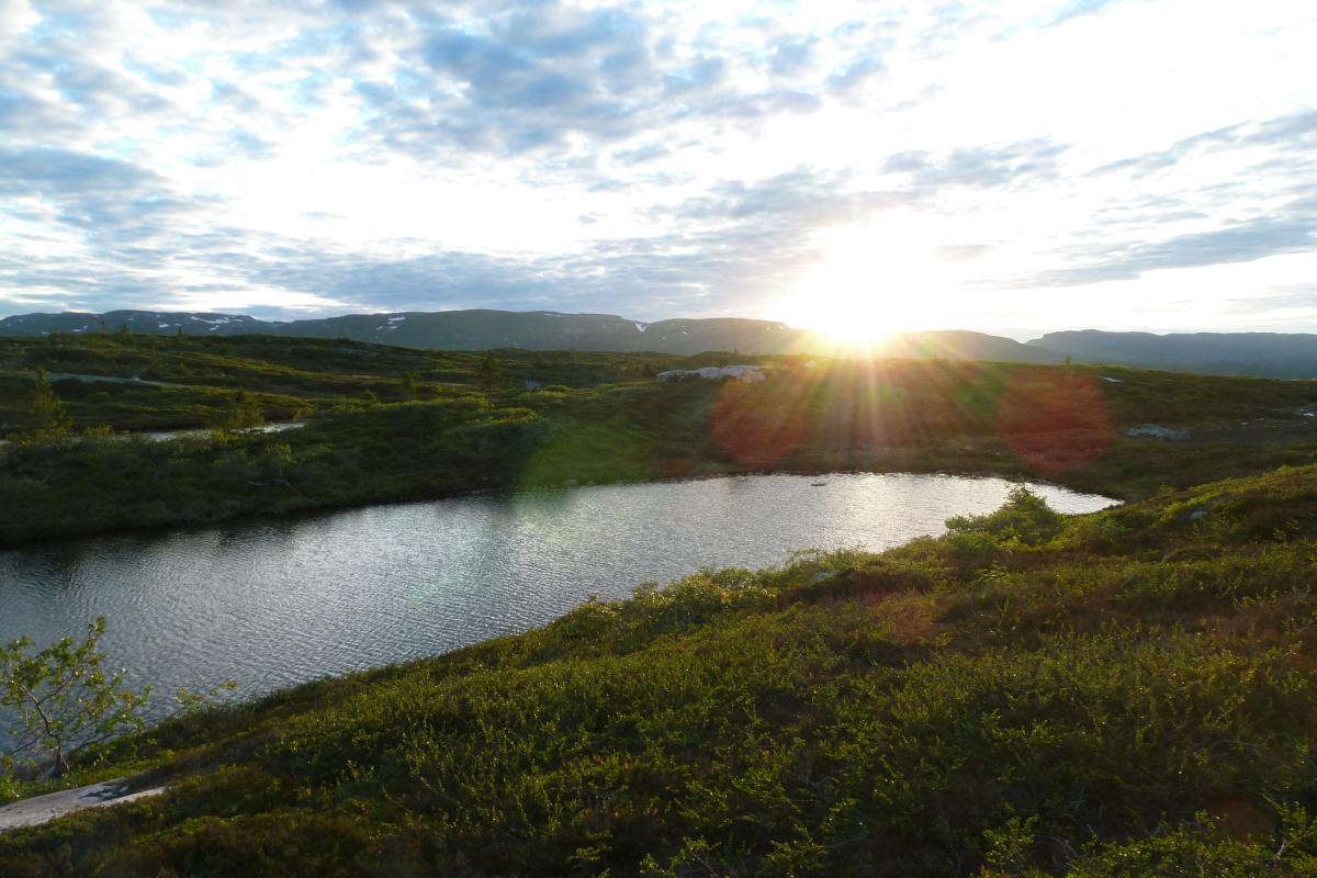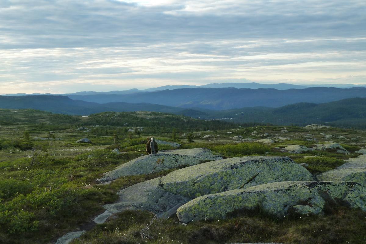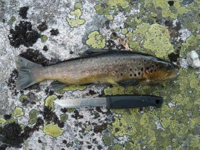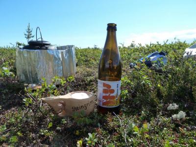 Det er vel på tide å komme med en turrapport her for meg også! Mellom huskjøp, bytting av jobb og leveranser av gigantiske prosjekter klarte vi å presse inn en liten tur på fjellet, Turkompisen og jeg. Nå skulle vi endelig få slappet litt av og nyte roen og stillheten i fjellet. På forhånd hadde vi blinket oss ut Blefjell som et sted vi hadde lyst til å besøke. Valget stod mellom Store-Ble med (relativt) høye topper og Vesle-Ble med sitt viddelandskap og mange vann. Vi liker riktignok topper, men denne gangen var det vidder og vann som lokket mest. Bilen ble parkert ved Fagerfjell skisenter i Flesberg tirsdag ettermiddag. Herfra skulle vi følge Storvasselva oppover til snaufjellet og lenger enn det hadde vi ikke planlagt. Ruta oppover langs elva var grei, ikke særlig tungt og stien ledet oss raskt opp til toppen. Planen var å bruke 45 minutter opp og der traff vi for en gangs skyld, brukte nøyaktig 45 minutter. En liten pause og vi speider nedover ruta vi har lagt bak oss. Fra tregrensa gikk turen videre i svak stigning mot Skintjenna (Skintjørna, Skjentjenna litt avhengig av hvilket kart du bruker) på 846 meters høyde. Det var ikke lange biten, anslagsvis en time med trasking fra tregrensa der Storvasselva startet, kanskje litt mindre. Ved Skintjenna vaket det intenst da vi kom frem og avgjørelsen ble tatt på stedet, her blir vi, hvertfall for i natt! Sola går ned over Store-Ble. Telt ble satt opp i en fei, en medbrakt ølboks gikk ned som motivasjon, og snart var fiskestengene rigget. Vi holdt det gående til ca 0230, midtsommernatta i Norge er fin sånn sett. Skintjenna er to vann adskilt av en liten bekk som det ikke var vann i nå. Neste morgen våknet vi til fantastisk vær og egg & bacon ble inntatt sent ut på dagen, det blir gjerne sånn når man fisker halve natta. En ting vi ikke hadde tenkt noe særlig på dagen før var at det var særdeles tørt overalt. Det skulle vi snart finne ut, da det var på tide å fylle på drikkeflaskene. Samtlige elve og bekkeleier var helt inntørka. For hver tiende meter lå det dessuten en lemenskrott. Dermed ble det koking av vannet fra Skintjenna. Vannet hadde en delikat myrsmak med en touch av lyng, fargen var lysegul. Passer godt til sjømat. På en dagstur i området forsøkte vi å finne bedre vann, men det var tørt overalt. Det skulle dog snart endre seg. Stort sett fint vær, skiftende skydekke, byger og utrygt for torden. Haandbryggeriets Fyr & Flamme er aldri feil, anbefales til ørret Vi dro opp en rekke ørretpinner i denne størrelsen, 200-300g alle sammen. Passet utmerket i stekepanna. Merk: kniven er i størrelse XXL, sabel er vel riktig betegnelse, ikke kniv. Vidde og fjell så langt man kan se. Onsdagen forløp uten at det egentlig skjedde noen ting, slik liker vi det best. Vi fisket, vandret, sov litt og fisket igjen. Og plutselig var dagen over. Terrenget i Vesle-Ble er lettgått med mye myrer. Leirplassen ved Skintjenna. Torsdag var planen at vi skulle forflytte oss, før hjemreisen fredag. Vi somlet og utsatte avreisen til langt ut på ettermiddagen, før vi pakket telt og sekk og vandret av sted. Planen var å legge oss ved Fagerfjellvanna, slik at vi bare hadde en kort spasertur ned til bilen neste morgen. Men det var planen, og ting går ikke alltid etter planen. Etter ca 20 minutters vandring havnet vi INNI en tordensky, det føltes hvertfall slik. Lyn slo ned på alle kanter og vi valgte etterhvert å søke nedover og til slutt ble det så ille at vi søkte ly bak en stein. Og så kom haggelet. Bordtennisballer ble skutt med mitraljøse fra oven og minnene fra en haglskur på Sørøya i Finnmark i fjor dukket opp og diskusjonene dreiet seg om hvilken haglskur som var verst. Etterhvert gjorde disse bordtennisballene så vondt at vi måtte trekke liggeunderlaget over hodene for å ikke få flere blåmerker og dermed vant faktisk Blefjell over Sørøya på akkurat dette området. Og slik satt vi i 90 minutter. Dessverre har jeg ingen bilder fra denne hendelsen, men det var riktig så trivelig. Kameraet var godt innpakket og lå tørt og trygt i sekken. Da de verste bygene ga seg og vi skulle vandre videre til Fagerfjellvanna begynte turfølget å fantasere om hamburgerne på Lampeland og tørre klær. Jeg forsøkte å forklare at tøyet han hadde i pakkposer i sekken sikkert var tørt det og, og at i teltet kunne jeg diske opp med Rett-I-Koppen og cognac, men turlysten hans var borte og han ville hjem. Sånn er det noen ganger, heldigvis hadde vi kort vei til bilen, og det nyttet ikke overtale til nok en teltnatt denne gangen. Hadde vi kommet avgårde tidligere denne dagen hadde vi nok blitt en natt til... Alt i alt var det en deilig tur, avslappende og i flott terreng. Skal nok reise tilbake hit en gang, gjerne med ungene.