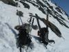 Det var veldig bløt snø opp og ikke noe is, så stegjern trengtes ikke. Det gikk egentlig greit med store stive støvler. Antagligvis er det nok bart i den bratteste hellinga allerede.