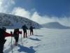 Det har etter hvert blitt tradisjon å ta toget opp til en vårskitur i Skarvheimen. Dette er 6 året. Jeg og Rødtopp fikk med oss 4 andre turglade folk. Etter å ha kontaktet Finsehytta skremte de oss bort med at Skarverennet skulle gå samme helg vi skulle dit. Dermed ble det Hallingskeid og Geiterygghytta som fikk besøk i år. Steder vi enda ikke har vært på, men det er også fine og trivelige hytter. Lørdag 22.04 Våknet til stålende vær på Hallingskeid og bra skiføre. Gledet meg til å sette i gang under hele frokosten. Jeg hadde som mål å komme opp på Såta (1558 moh) - en markant topp midt i Såtedalen. Det ble bare meg som kom til topps, det viste seg å være vrient å finne vei opp vinterstid. Østsiden er den slakeste, men den var det mye fokksnø i og dermed vurdert som rasfarlig. Østsiden og nordflanken ble vurdert til å være for bratte. Dermed var det sørflanken toppstøtet måtte gå opp. Det var tynt snødekke og greit å komme til ca 10-15 høydemeter under toppen. Der var det ett usatt punkt som krevde klyving, men jeg klarte å svinge meg rundt. Det var flott utsikt som toppet dagen. På ettermiddagen begynte det å blåse opp og det var ganske frisk vind når vi kom frem til Geiterygghytta. Søndag 23.04 Ble veldig preget av sterk motvind, snødrev, dårlig sikt og ett par varmegrader. Vi valgte å gå Kyrkjedøra alikevel. Det ble stående lunsjbuffé på Kyrkjedørsvannet. Vinden begynte å løye og snøværet roe seg ned når vi nærmet oss Finse, dermed stoppet vi i lia 500 m unna stasjonen, koste oss og drakk kakao.