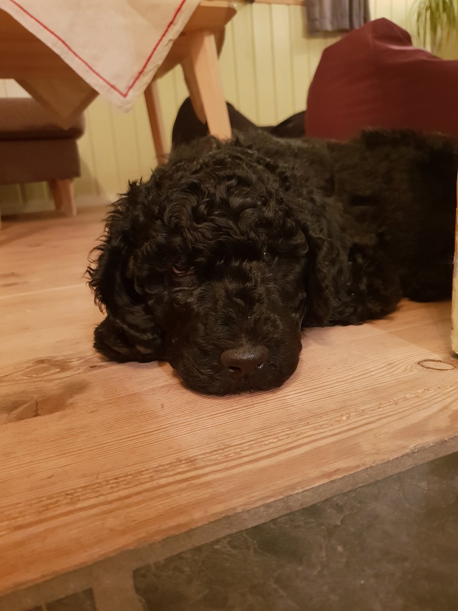 Her er familiens nyankomne tilskudd. Vil forhåpentlig også bli pappas turkompis, og kanskje opptrekker for ungene når skisesongen er der, i tillegg til å være en skikkelig familiehund. Åtte uker gammel labradoodle.