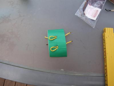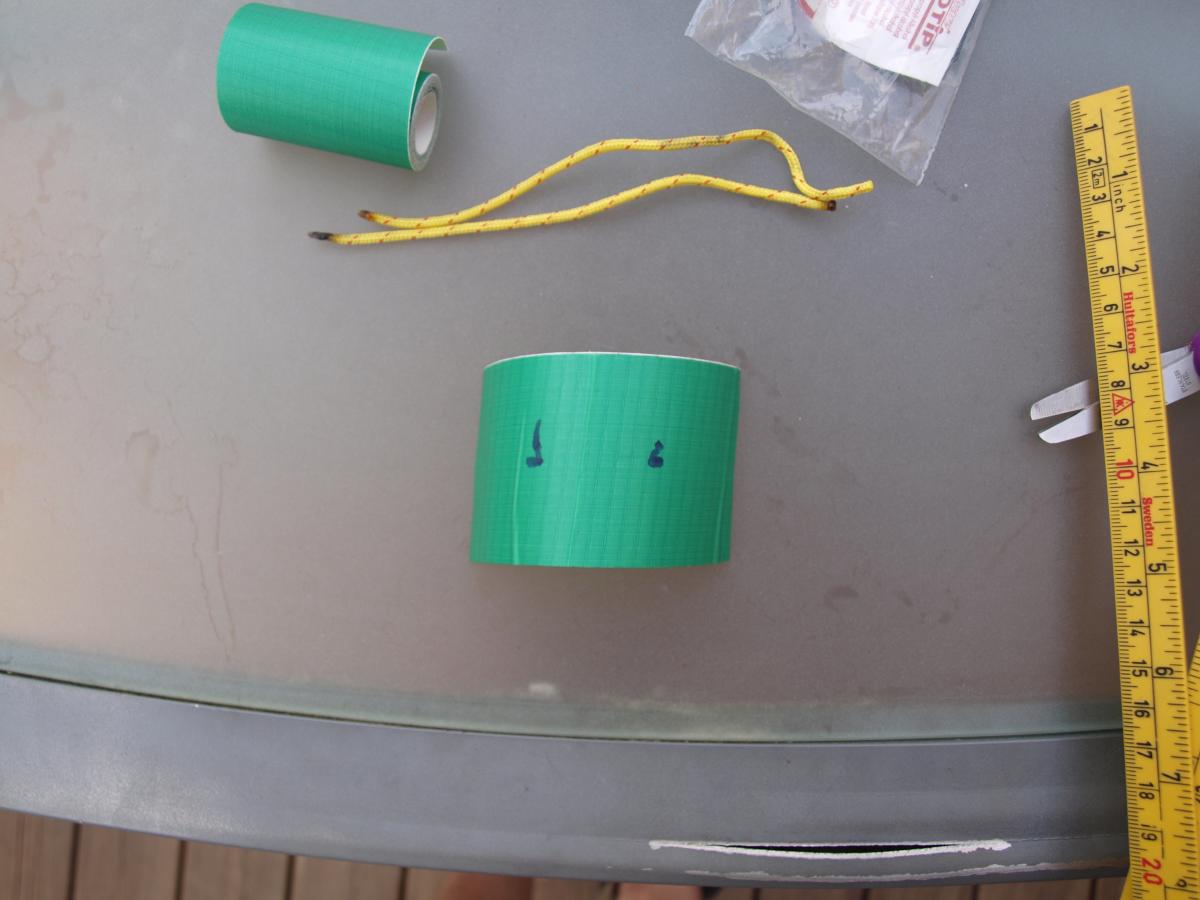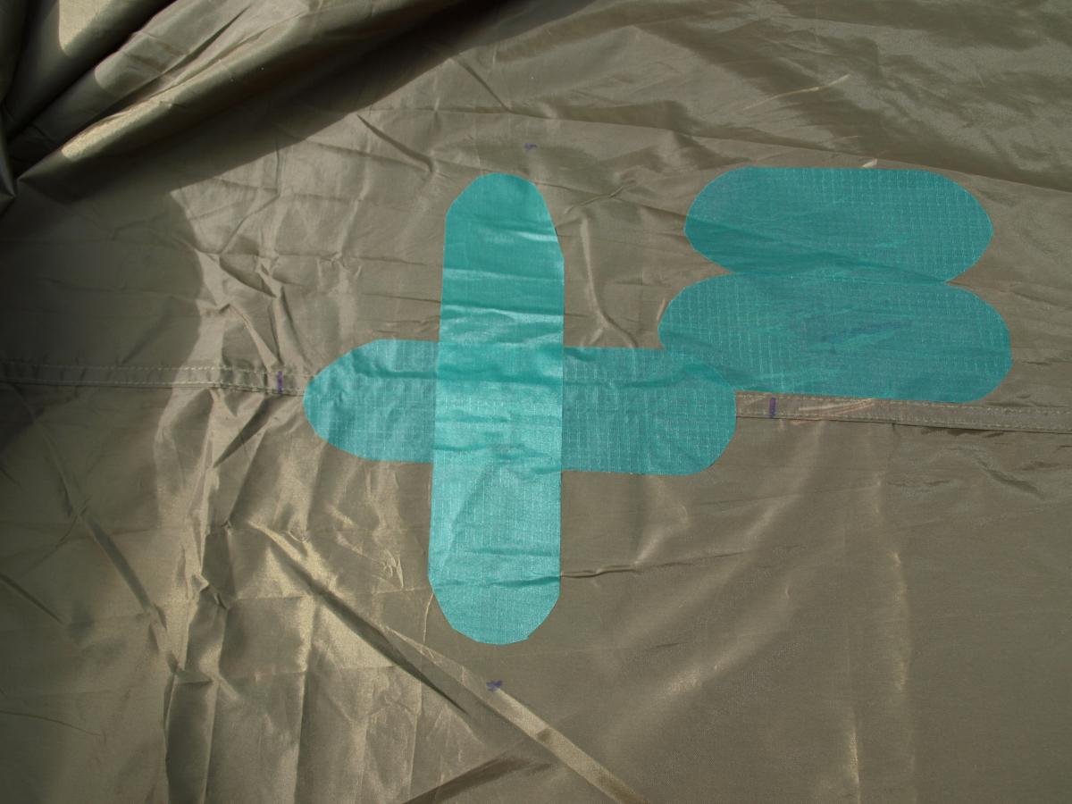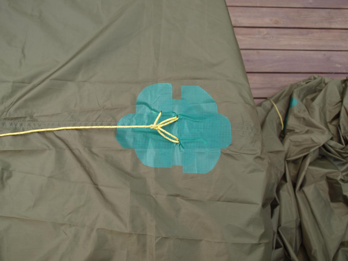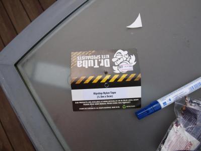 24. Da har jeg gjort del 1 av modifiseringen, dvs jeg har lappet et hull, forsterket duk for plassering av stokk/stav fra undersiden og prøvd å sette på et bardunfeste på duken. Alt er versjon 1.0, godt hjulpet av flinke barnehender. Jeg fikk ikke tak i spinnakerteip, men da det ble sagt at det ble brukt på kiter, tok jeg en tur på nærmeste kitebutikk og kjøpte denne tapen. Tanken var at jeg langsetter ryggen på tarpen (som er 3x4 meter, så ryggen er langsetter 4-meteren, midt på 3-meteren, går en søm der også) skulle forsterke duken en meter inn fra den ene enden, og lage et bardunfeste en meter inn fra den andre siden. Forsterkningen gjorde jeg som et 20x20 cm kryss på begge sider. Villige barnehender skulle holde duken stram for meg: Var litt for sent å reagere etter at lappene var klistret på, så noe krøller ble det. For nytt bardunfeste tok jeg enden av en bardun og lagde to like lange stumper. Så klippet jeg hull midt på en teipbit. Tredde trådene igjennom og klistret i vei Satte på ekstra med teip for å forsterke festet: og satte på bardunen Ble det pent? Ikke særlig, om jeg må si det selv. Har heller ikke fått prøvd det ut, det kommer i del to Om dette er den mest fornuftige måten å sette på et nytt bardunfeste vet jeg ikke, men jeg prøver nå slik. Her har jeg bare teipet og ikke sydd noe i det hele tatt. Kanskje det ikke holder, men det gjenstår å se. Forsterkning av duken for å tåle mer bør i hvert fall duge. Del to blir først når jeg har prøvd det ut, så får vi se om det er mye breking og lite sau, eller om det duger i det virkelige livet og.