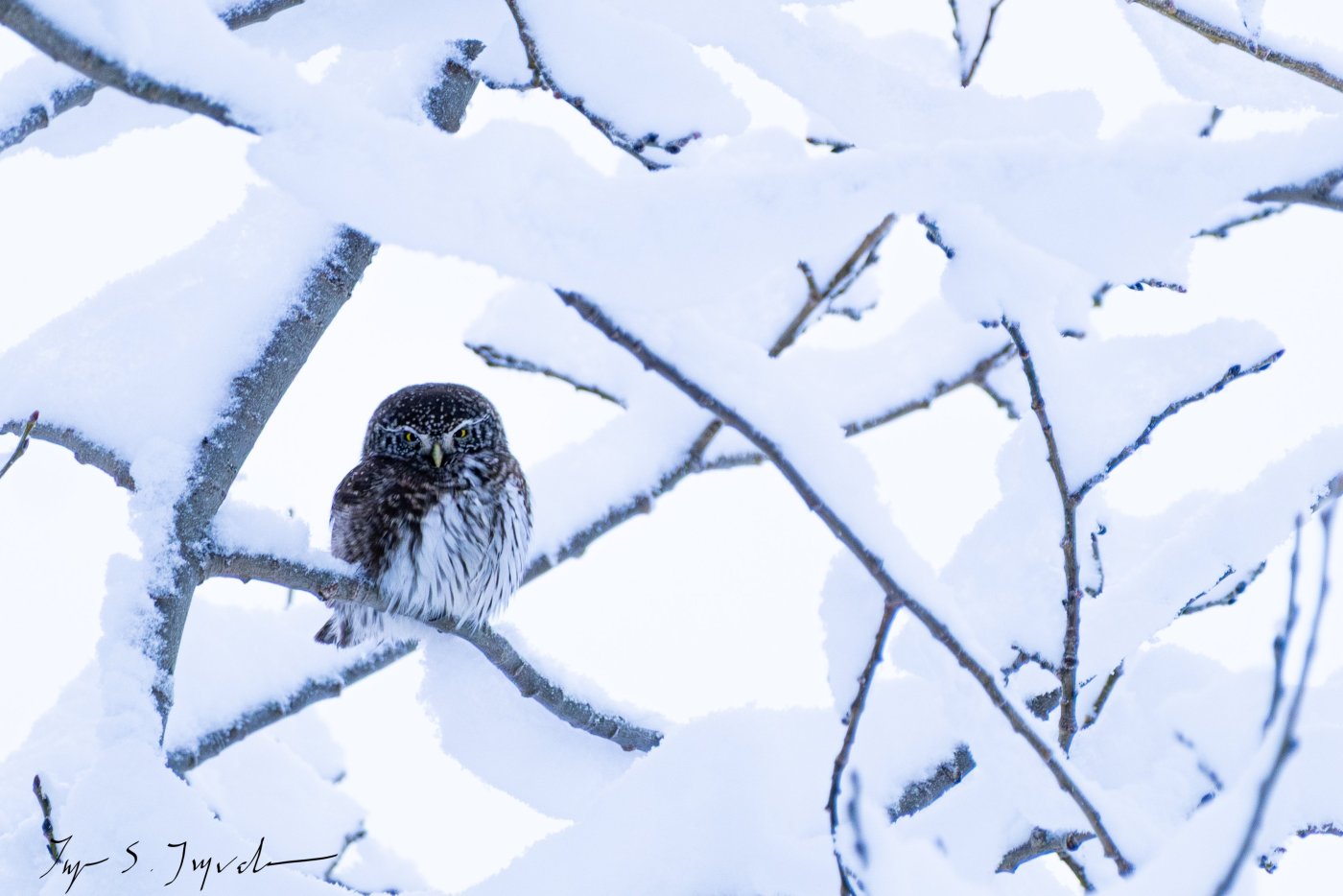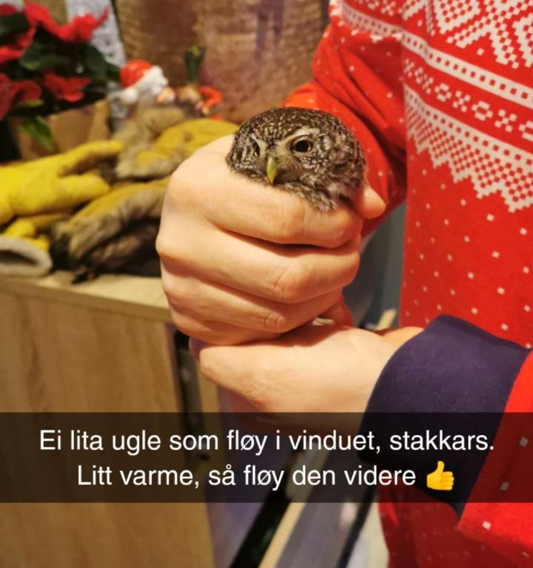 I dag fløy det en liten spurveugle inn i vindusruta, mens jeg enda var i julepysjen! Den ble liggende i snøen, og med bikkja løs ute sammen med ungene, måtte den hankes inn. Etter litt varme og omsorg i yttergangen, fløy den videre til nærmeste busk. I buska poserte den på et vis bare ugler kan posere! Var det et lite takk? Flaks for meg fløy den opp i nærmeste busk, og poserte så flott som bare ugler kan gjøre! Litt småkjipt fotolys ga en del forstyrrelser, men klarte å redusere noe av dette i Lightroom. Nå flyger den videre inn i 2026! Godt nytt år alle sammen! 🎆🎉