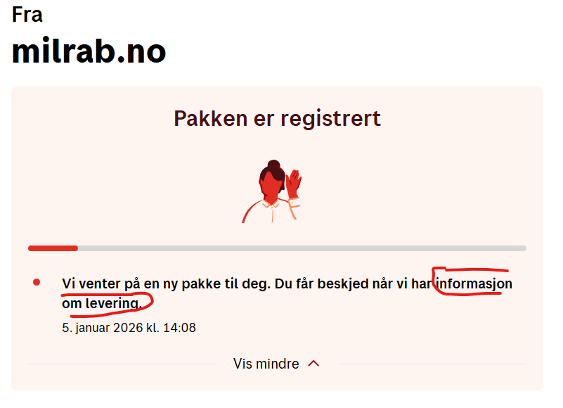 Er den ulike sporingsstatusen hos Ingrid og Posten grunn til bekymring? På siden til Ingrid kommer det opp at pakken er levert (inn til Posten/transportør?), mens hos Posten står det at jeg får beskjed når vi har informasjon om levering. 4