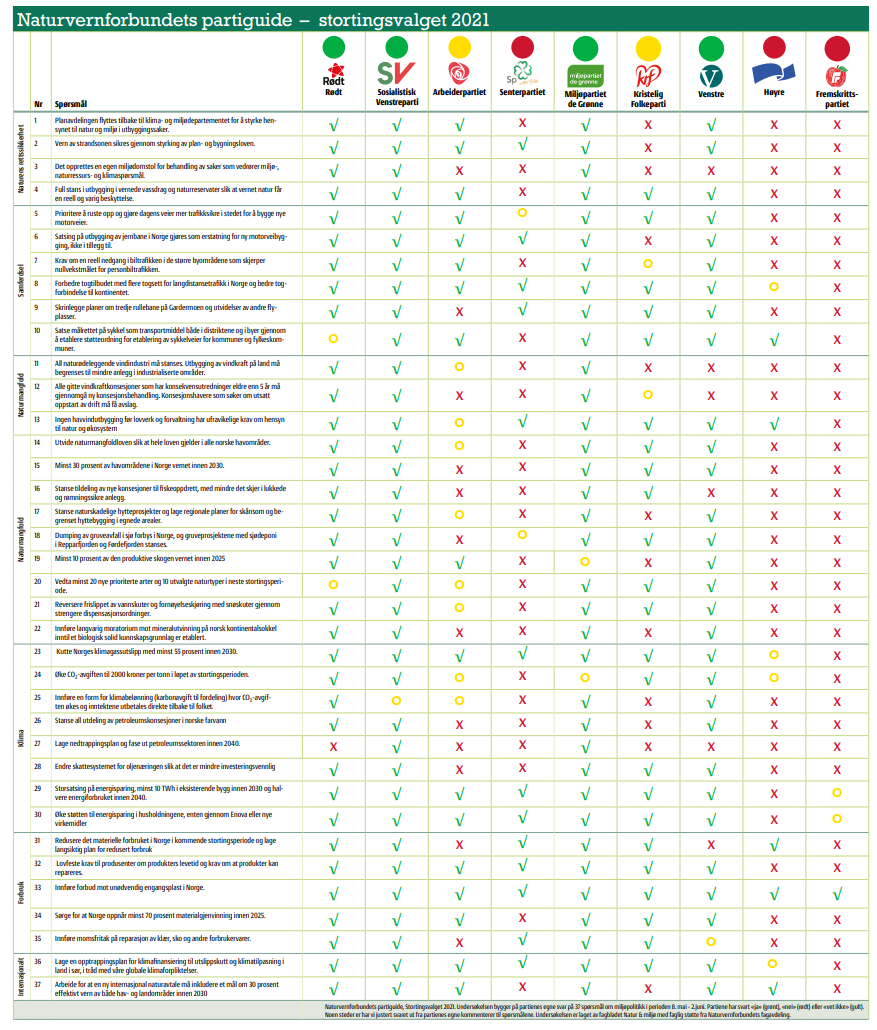 Uten at jeg skal fronte noen spesiell type politikk, så er det jo noen partier som er bedre enn andre å stemme på, hvis man ønsker en annen politikk. Verstingene er uten tvil AP, SP, H, Krf og FRP (INP kommer nok inn på denne lista om de kommer inn på Stortinget). Dette er partier som har tro på evig vekst, og overmodig tro på lokale beslutninger. Dette er også partier som i stor grad har styrt landet de siste 11 årene. Det hadde sett enda værre ut om ikke Erna var avhengig av Venstre, og Jonas må ha støtte fra SV. V, SV, R og MDG vil nok være en brems i en slik "utbyggingsbonansa". Naturvernforbundet laget denne oversikten før forrige stortingsvalg i 2021, som langt på vei understøtter det (ikke rangert, se fargekode over hver partilogo. Trykk på tabellen for å få større bilde):- 73 svar