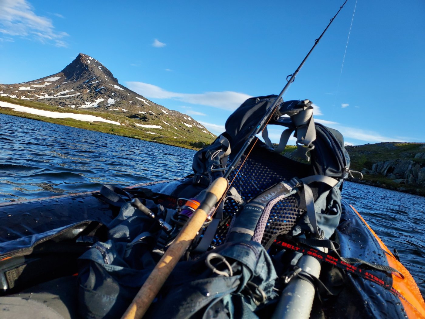 Fiske fra packraft var ikke så silkemykt som jeg hadde sett for meg. Det blir litt ekstra plundring, særlig hvis det er litt vind. I går støtte jeg på en ny problemstilling. Når man har montert sekken i front, hvor gjør man av fisken? I mitt tilfelle ble den liggende oppi håven, i fanget, mens jeg løsnet krok og avlivet den. Dette førte til at jeg ble veldig våt, samtidig som at jeg følte at jeg ble fryktelig tilgrisa med fiskeslim. Nå er kanskje ryggsekken montert veldig langt bak, men fant en god festeanordning på denne måten. Kanskje burde jeg hatt sekken lengre frem i baugen, for å få mer armrom foran meg til å hamle opp med eventuell fisk? Bildet ble så som så.. -