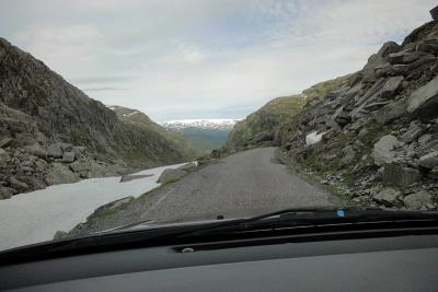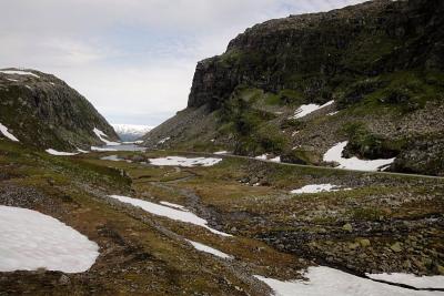 Det første jeg kom til å tenke her vestafjells var gamleveien mellom Røldal og Seljestad. Det er et snøhull til vanlig. I nordhellingene oppi der bør det kunne ligge noen snøfonner ennå antar jeg. Jeg har riktignok ikke kjørt over den veien i år, men var i fjellområdet like vest og så at det var en del snø i nordhellingene rundt omkring. Fine teltplasser langs den gamleveien må sies. Bildene her er fra sist i juli i fjor.