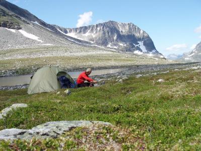 Over og ut, ja. Jeg tenker at så lenge man gjør det man gjør med ærlighet (og derfor av en form for nødvendighet), er det bare å gjøre det. Man sier aldri farvel til sivilisasjonen i dag, man tar i beste fall kun en pause. Sivilisasjonen eksisterer til enhver tid i bevisstheten vår og ligger der som en garantist for at alt vil gå bra. En nødpeilesender blir bare en utvetydig konkretisering av denne bevisstheten. Vi i Norge skal være veldig takknemlige for at vi både kan si opp jobben og ha midler til og trygghetsfølelse nok til å være ute i naturen eller på en eller annen reise i lang tid. Her til lands har man ingenting å frykte annet enn våre egne negative følelser, frykt og eventuelle ensomhet. Personlig har jeg ingen drøm om å gjøre noe lignende, men jeg forstår deg, Erik, og andre som tar de samme valgene. Erik, fortsett å være ærlig med deg selv. Ikke bruk for mye penger på utstyr (penger kan brukes mye bedre, f.eks. til å kjøpe mer fritid). Lykke til! Min greie har vært følgende: ha lite gjeld og utgifter, jobbe deltid (ca. 50 % fast) og dra på relativt mange og kortere turer. Sjelden mer enn én uke om gangen. Særlig fra 2006 - 2009 var det greia. Men jeg mistet den indre roen av flere grunner. Dessverre. Jeg kjenner for tiden et savn etter å oppleve den indre roen som naturen gir. Nå er det lenge siden jeg har vært på alenetur, senest mars 2013. Men det har vært svært få de siste årene. Selv om jeg har vært på flere aleneturer og kjenner lysten til å dra på flere igjen, så er det noe som holder meg tilbake. Frykten for å være alene. Frykten for mørket. Jeg har nå vært for lenge i sivilisasjonen. Søkt trygghet gjennom andre mennesker og forsterket min egen redsel. De sansene som vekkes til live når man er alene i naturen, de er blitt slått av. Jeg er redd for å være alene og redd for mørket fordi det er så lenge siden de var slått på. Til slutt et bilde fra en alenetur i Trollheimen 2006 - frokost i juli (når det er lyst døgnet rundt):- 58 svar
