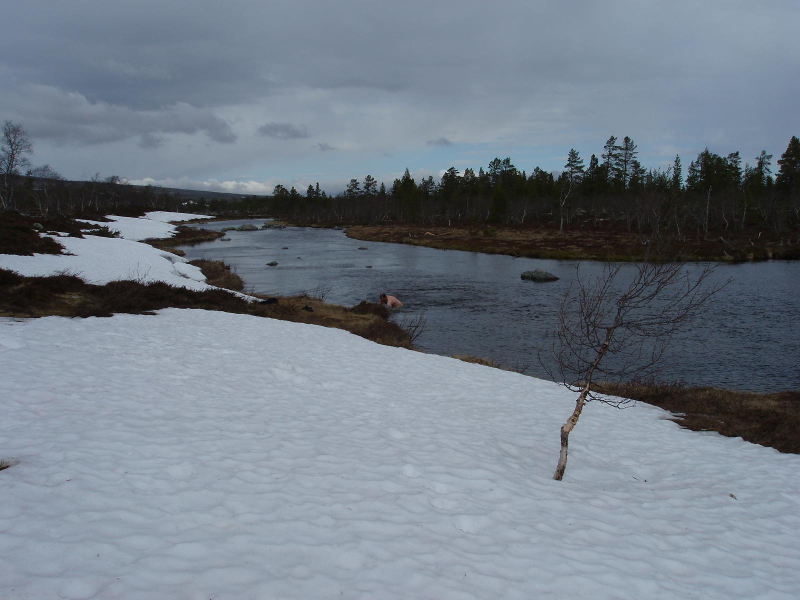 Det er noe mer snø 1. mai i år enn 1. mai i 2009, ifølge SeNorge.no. Jeg var der i slutten av mai 2009 (21. - 24. mai) og da så snøforholdene i Grøtådalen og nordsiden og sørsiden av Store Svuku (på bildet med telt ser vi nordsiden), slik ut. Bildet av elven er elva Grøtåa (jeg bader selvfølgelig ). -