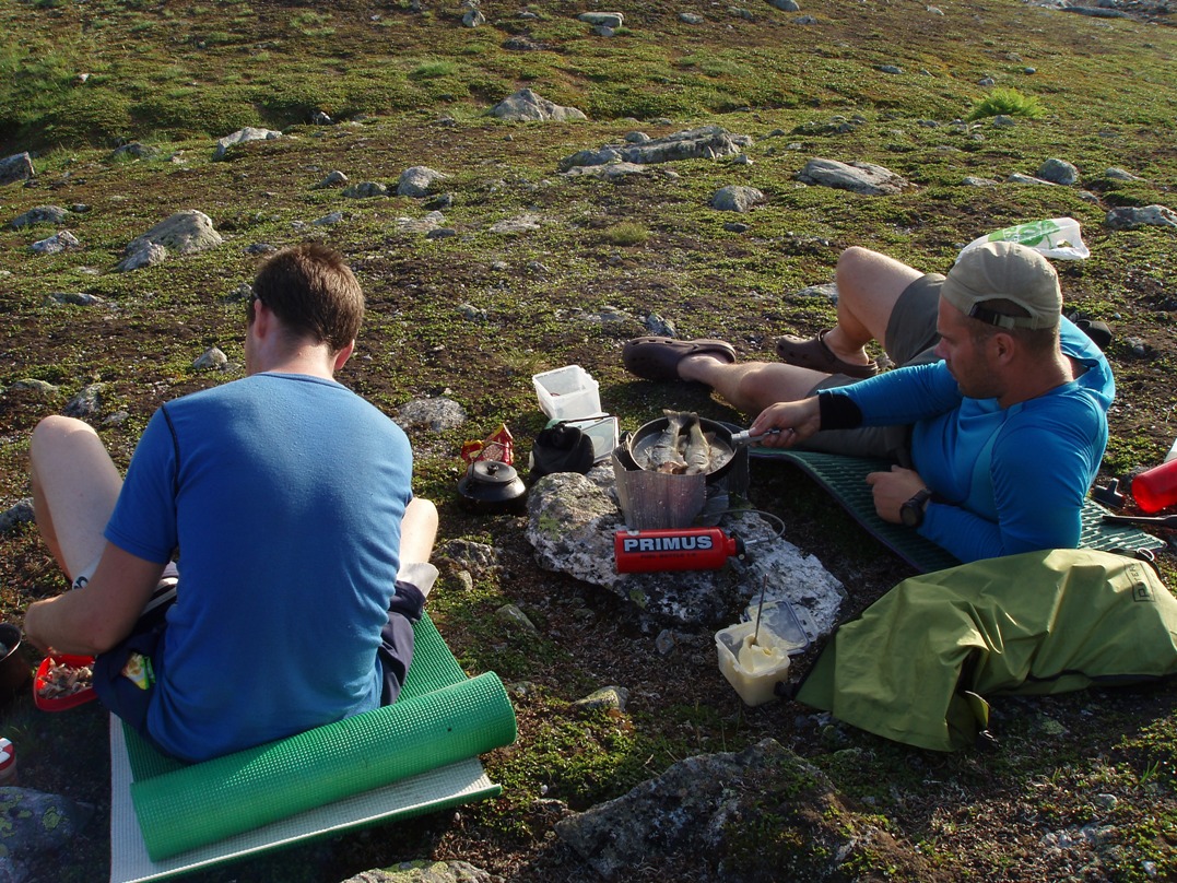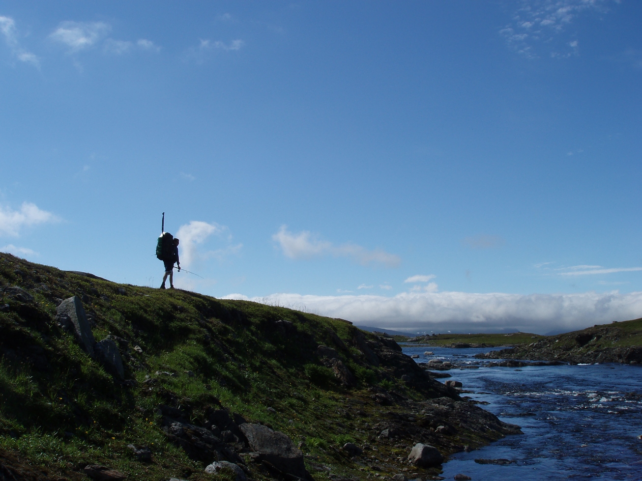 Det var blitt kveld. Skyene som hadde ligget over oss siden vi startet, forsvant. Vinden avtok og temperaturen falt. Før det ble helt mørkt, så vi frostrøyken stige fra tjern og vann. Midt på natten våknet vi til intens rypeskvatring. Ja, og ut på morgenen våknet jeg igjen, da til en helt annen lyd, ukjent, som om noe romsterte i tingene våre. Jeg tenkte med en gang på bjørn, for igår hadde jeg oppdaget et bjørnespor rett nedenfor kollen vi lå på. Vi befant oss i Finnmark og hadde slått leir i Øvre Anarjohka nasjonalpark. Uvillig løsnet jeg på soveposen, reiste meg opp i sittestilling og fikk åpnet glidelåsen til teltet. Lyden var der fremdeles. Skulle jeg titte ut? Jeg måtte anstrenge meg for å få hodet ut av teltåpningen. Og der, der fikk jeg øye på bråkmakeren. Det var hunden min som hadde hele snuteskaftet nede i smørpakken vår. Det var to hovedformål med turen. Vi ville ha svar på om månedslange turer var noe for oss, og så ville vi se Finnmark. Fra Sihccajávri til Suossjávri brukte vi 13 dager, vi gikk i snitt 11 km per dag. Landskapet var som man foventer av en vidde, flatt og ensformig. Denne etappen var egentlig ganske kjedelig, og grunnen var bare delvis at det var mye myr, kratt og ensformige, vide flater. Den egentlige grunnen var at vi gikk så korte dagsetapper og at det var overraskende få fiskemuligheter. Alle mindre vann som ikke har tilsig fra elv, er døde fordi de bunnfryser om vinteren. Først etter en drøy uke (bl.a. pga. ruta vi hadde valgt) kom vi til et ordentlig vassdrag, nemlig Áhkkanasjohka, en ganske stilleflytende elv som til slutt renner ut i Karasjohka. Der dro vi opp et par kilosørreter, og faktisk en del gjedde. Denne delen av vidda gjør seg nok best sent på høsten, da all bjørk og lyng er rød og gul, eller kanskje helst om vinteren, da alt er vidunderlig hvitt og uendelig. Etter 13 dager på vandring, fikk vi tre dager i Karasjok, hvor vi blant annet hentet kanoen. En stor, grønn gummibag stod bak disken på posten på Coop Mega. Vi stusset, for årene skulle jo ha vært festet til sekken. Det var de ikke nå. Heller ikke betjeningen visste hvor de var. Det skulle vise seg at årene hadde forsvunnet underveis. For å bøte på dette, var vi overalt i Karasjok, t.o.m. i en byggevarebutikk, men ingen hadde årer å oppdrive, vel, hvis vi da ser bort ifra ham som hadde et par små barneårer beregnet til gummibåter. Tidlig i overimorgen skulle vi dra videre, så vi måtte skaffe årer kjapt. Lakselv er nærmeste tettsted, men bussforbindelsene er dårlige, det gikk dog en buss til Karasjok imorgen, så vi tenkte at vi kunne ringe noen sportsbutikker og kanskje be om en aldri så liten tjeneste. Ved Intersport i Lakselv tok en som heter Erik telefonen. Vi spurte om de hadde årer. Ja, det hadde de. Vi er i Karasjok, forklarte vi, og har ikke bil... Kunne du sende dem med bussen imorgen? Ja, det kunne de! Men hvordan skulle betalingen foregå? Enden på visa ble at en kamerat av Erik plukket opp årene på bussen i Karasjok og kjørte dem til hytta vi leide på Karasjok Camping! Slik fikk vi årer og Erik betaling! Med årer og kano tok vi fatt på neste etappe den 4. september. Mat hadde vi for tolv dager, men unntak av middag, som kun holdt til en åtte, ni. Vi regnet med å få fisk. Bussen gikk 05.55 og yr lå i luften som bløt masse. Innimellom ble yr til regn, kaldt regn. Det fristet ikke å legge i vei på en ny etappe denne dagen. Men vi gjorde det som rett var og jobbet på. Slik fikk vi en pangstart og dermed en opptur i stedet for. Opp fra Suossjávri til Mollésjohka fjellstue, som er et populært sted mellom Iesjávri og Iesjohka, men som var helt tomt da vi kom forbi, er det fire bæringer hvorav tre av dem er mellom én og to kilometer lange, i tillegg er det et sted hvor man kan velge å line (første stryk etter Suossjávri), men da må man etterhvert ordentlig ut i elva. Oppover hele Iesjohka bet harren villig, og vi kastet selvfølgelig på vakene. Men den største vi dro opp, tok vi ved Iesjavri. Fine 1.1 kilo. Ett av problemene våre var at vi på den første etappen gikk for sakte gjennom et for oss delvis uinteressant terreng og lot være å bli værende på de stedene som virkelig var fine, for da hadde vi liksom ikke tid. På etappe to fortsatte dette, og det selv om vi hadde lange arbeidsdager. Vi følte rett og slett tidspresset og gav ikke oss selv muligheten til å ta noen hviledager. Hvis jeg skal komme med en anbefaling for sommer og høstturer, følg vassdragene i større grad enn vi gjorde. Dessuten er inntrykket mitt at vidda i øst, altså i Anarjohka og nordover mot Karasjok, er mer severdig. Der er det også en annen type skog, hvis jeg ikke tar feil. -