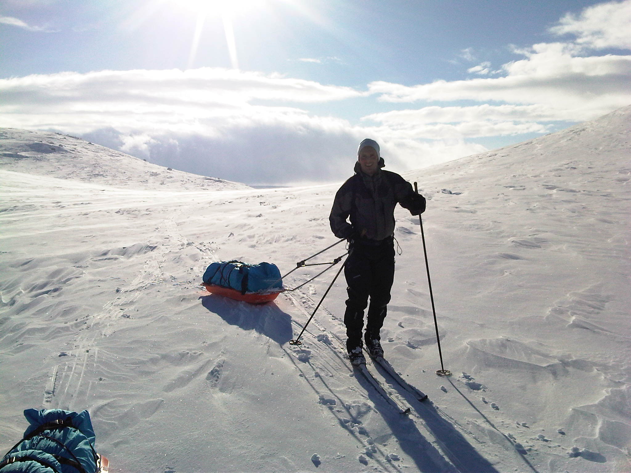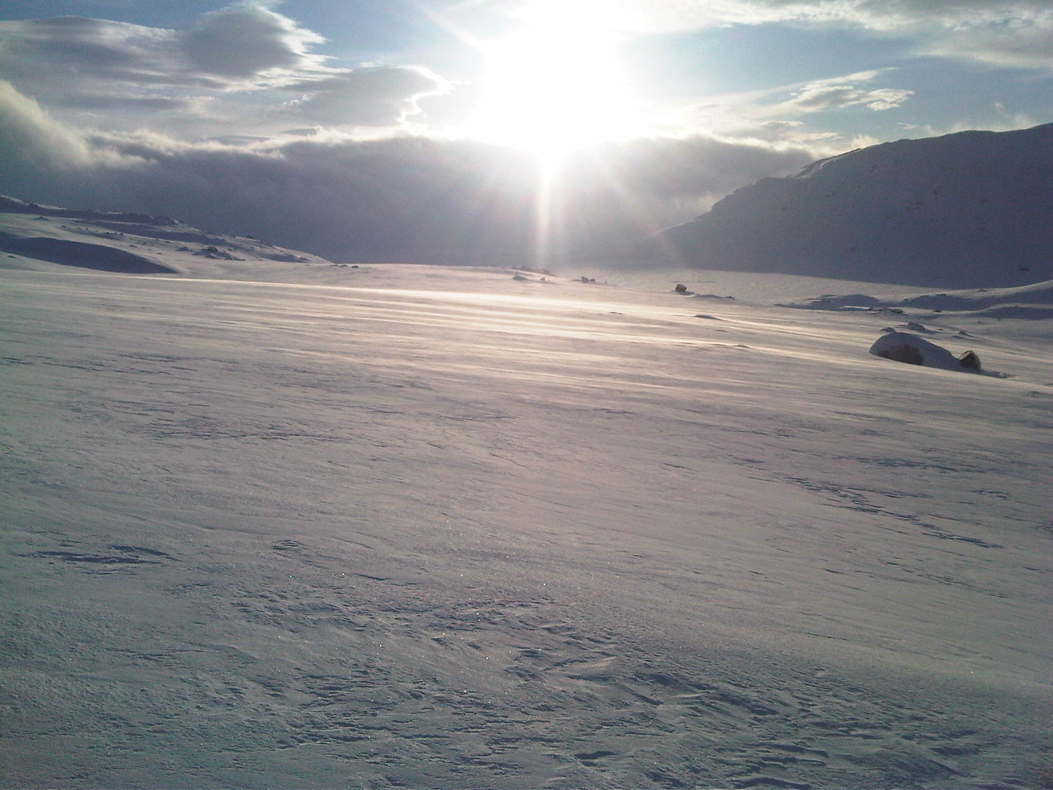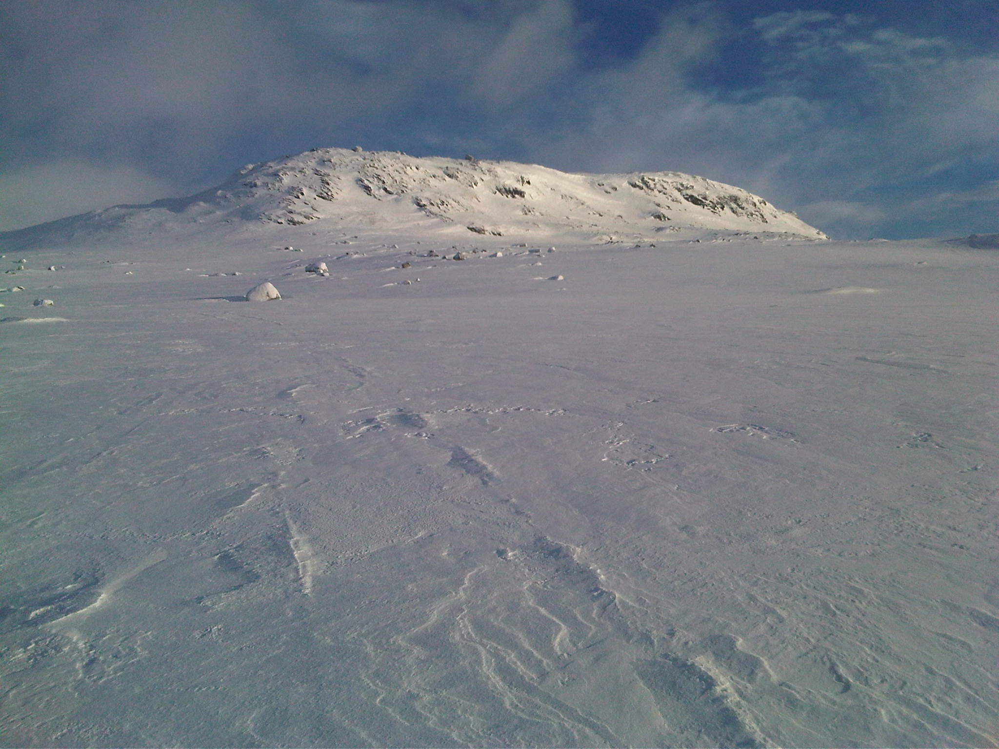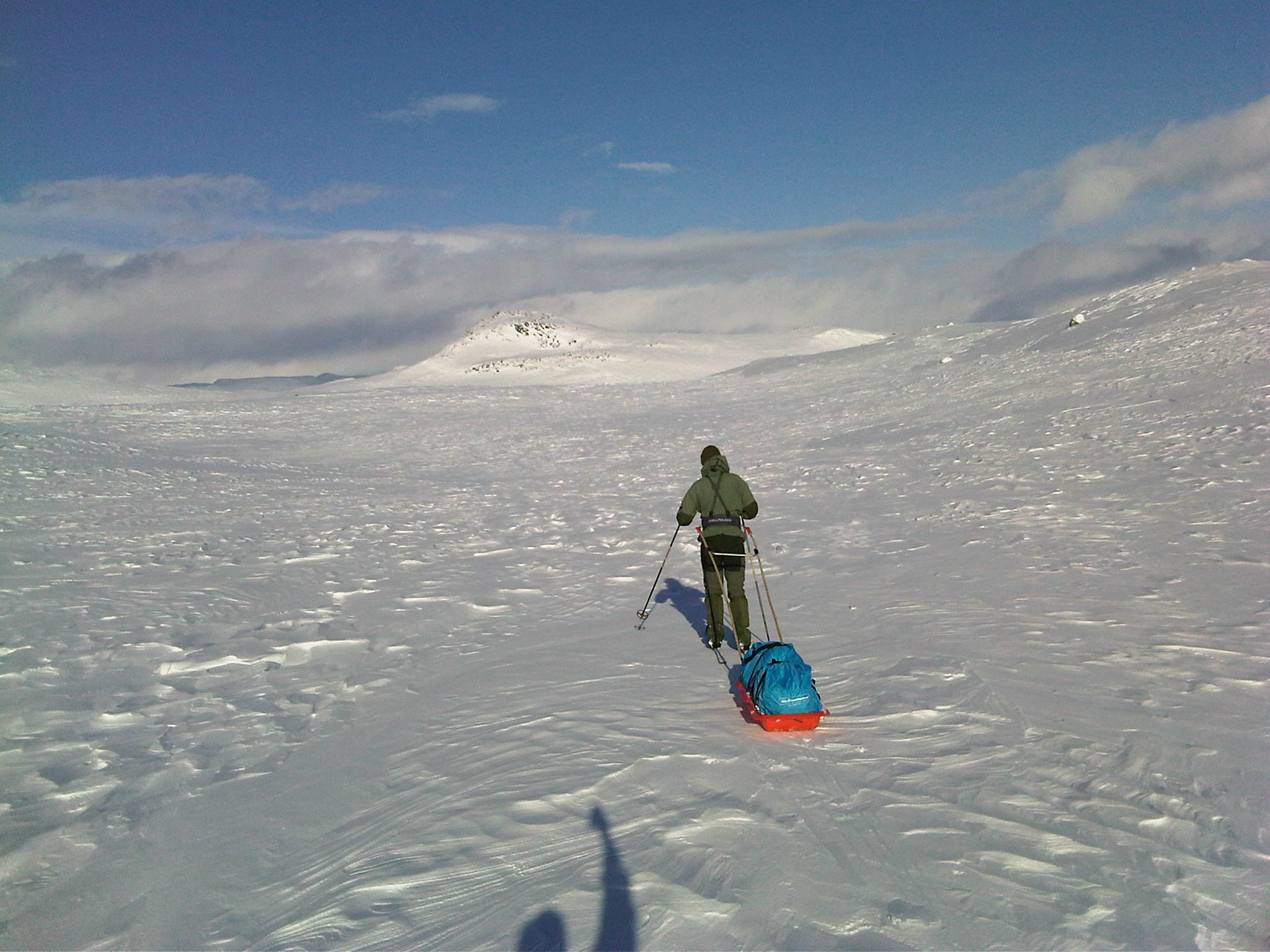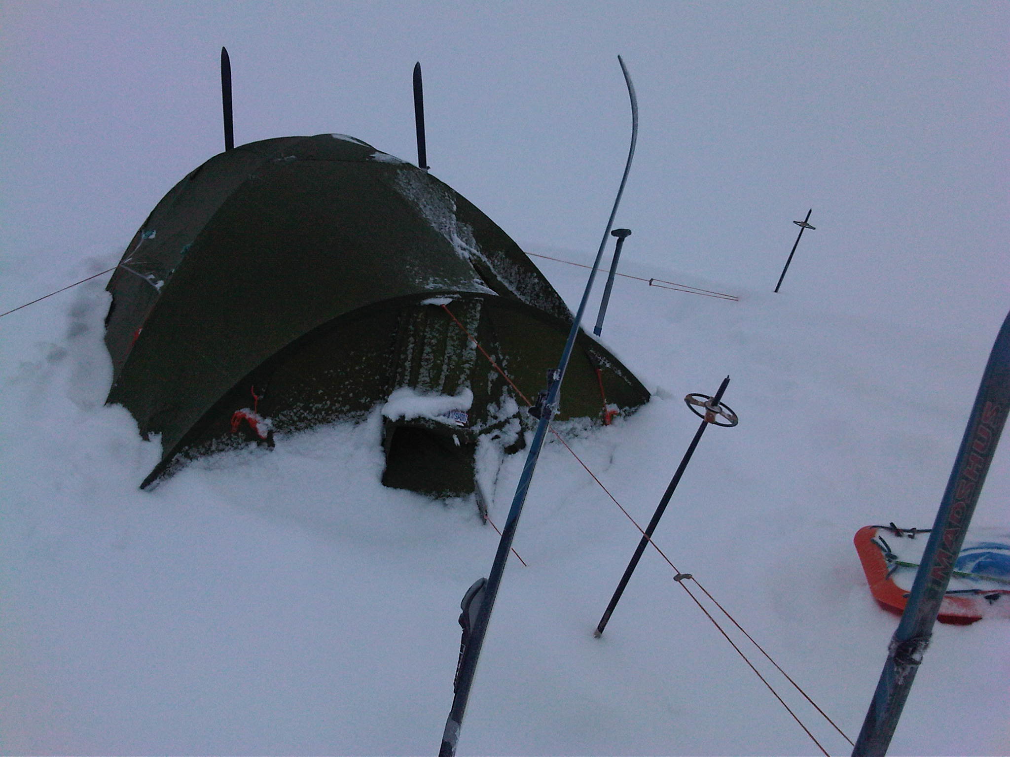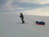 Onsdag forrige uke (23.feb) startet en kamerat og jeg turen som var planlagt å gå over Hardangervidda fra Haukeliseter i sør til Dyranut i nord. Dag 1: Litt nord for Haukeliseter Vi tok Haukeliekspressen fra Oslo, og var framme på Haukeliseter ca kl 15 onsdag. Det var meldt skiftende ustabilt vær, så vi visste ikke helt hva vi hadde i vente på værfronten. Når vi ankom Haukeli var det overskyet og snø. Planen vår var å komme oss noen km nordover før det ble mørkt og slå opp teltet der. Starten fra Haukeli er ganske bratt og tung. Ca 150 høydemeter på 500 m er en tung start:) Det var relativt mye løssnø, vi sank ca 30 cm så vi ble fort varme når vi kom igang. Etter ca 2,5 km begynte det å bli mørkt, og vi fant en fin teltplass i ly for sønnavinden. Det ble en kald natt, ca -20 grader. Allikevel kom det en del snø ila natten (se bildet). Dag 2: (litt nord for..) Haukeliseter - Hellevassbu (Ca 23 km) Dagen startet med tett skylag, og veldig dårlig sikt. Det skråe lyset førte til at det var vanskelig å se konturene i terrenget, og kombinert med dårlig sikt førte det til å vi måtte gå hovedsaklig etter GPS'en. Første 5 km var tunge med fortsatt ca 30 cm løssnø og dårlig sikt. Vi regnet med at dette kom til å bli en lang dag fram til Hellevassbu, da snittfarten på de første km var lav. Når vi kom oss opp til Mannevann ble derimot føret betraktelig bedre. Det blåser mer i denne høyden, og snøen bar betydelig bedre. Sikten var fortsatt dårlig, men snittfarten økte sakte men sikkert. Lunsj tok vi i ly ved en hytte ved sørenden av Årmotvatni. Tyngste del av etappen var overstått og vi befant oss på ca 1200 m høyde. Selv om vi såvidt var halveis til Hellevassbu i distanse, så gikk siste stykke veldig greit. Vi fulgte et dalsøkke så og si hele veien videre til siste nedfart ned til Hellevassbu. Tok en 5 min pause ved Knutsbu. Dårlig sikt og snø hele dagen, men totalt sett gikk etappen allikevel greit. Ankom Hellevassbu ca kl 17. På hytta var det 3 karer som var på vei sørover. De hadde vært på hytta hele dagen pga det dårlige været, så vi kom fram til ferdig oppvarmet hytte:) Litt seinere utpå kvelden kom det 3 andre som også var på vei sørover. De hadde ligget i telt i 5 dager, og hadde hatt en voldsomt vindvær denne dagen. Opp mot storm styrke i visse perioder påstod de. Det må ha vært store lokale variasjoner denne dagen, for vinden hadde ikke vært så sterk for oss. Dag 3: Hellevassbu - (Littlos) Bismarvannet (Ca 24 km) Dag 3 startet grå, men klarnet opp så snart vi satte igang fra Hellevassbu. Sola skinte, og med et flott føre ble grunnlaget lagt for en perfekt dag. Kilometerne skle fort unna, og før kl var 12 hadde vi tilbakelagt 12-13 km. Dette var en perfekt dag i fjellet, og vi kunne ikke gjøre annet enn å nyte den fantastiske utsikten vi hadde. (se bilder). Planen var å gå til Littlos denne dagen, men det gikk fortere enn vi hadde forventet, så når vi kom til Kvennedalen fant vi ut at vi heller skulle krysse over Grotdalen og forsøke å nå Bismarvannet før det ble mørkt, og slå opp teltet der. Vi var usikre på hvordan været var meldt dagen etter så vi konkluderte med at etappen videre til Sandhaug ville bli 8-9 km kortere dagen etter om vi gikk til Bismarvannet isteden for Littlos. Mot slutten av dagen kom det et veldig værskifte. Det skiftet fra sol til overskyet og regn ila en halvtime. Trodde ikke vi skulle få oppleve regn midt på vidda i februar, men det gjorde vi faktisk:) Føret ble litt vanskelig, men det stoppet ikke oss i å nå Bismarvannet før det ble mørkt. Siste timen gikk vi i regn og tåke, så vi så ikke lenger enn skituppene våre.. Slo leir på vannet denne dagen. En flott dag hvor vi fikk oppleve det meste av vær:).... Dag 4: Bismarvannet - Sandhaug (Ca 14 km) Dagens etappe fram til Sandhaug var ikke mer enn ca 14 km, så vi hadde litt bedre tid i teltet denne morgenen. Vi kom igang ca kl 09, og sikten var omtrent like dårlig som dagen før. Etter et par timer ble derimot været litt lettere, og sikten ble ganske bra. Vindstyrken denne dagen vil jeg tippe var på ca 8-9 m/s, men vi hadde den i ryggen hele veien så det var ikke noe problem for oss. Vi hadde tenkt til å ta lunsjen ved Besso, men vi passerte der lenge før vi hadde regnet med, så det endte opp med at vi gikk helt fram til Sandhaug før vi spiste lunsj. Sandhaug stod åpen, uten at det hadde vært folk der på noen dager. Vi fikk fyrt opp og begynt å tørke alt som var blitt vått fra dagen før i telt og regnevær:) Var på Sandhaug allerede ved 13 tida, så vi fikk god tid til å slappe av med mat, drikke og Fjell og vidde blader:) Rett før vi ankom Sandhaug støkket vi opp 4 ryper som spankulerte en stund rundt oss:)... Dag 5: Sandhaug - Dyranut (Ca 25 km) Siste dag. Etappen mot Dyranut var flatere enn terrenget lengre sør. Dette var den "riktige" vidda! Selv om sikten ikke var all verden fra start var det et flott terreng med fantastisk natur. Utover dagen ble det bare bedre og bedre. Når vi stoppet ved Granahytta for lunsj, kom sola fram. Siste mila inn mot Dyranut var helt fantastisk, og vi fikk se Hardangervidda på sitt flotteste! Hentebilen vår stod klar, og litt vemodig var turen allerede over.. En fantastisk flott tur, hvor vi fikk oppleve det meste av værtyper Hardangervidda har å by på. Planen vår hadde aller først vært å gå motsatt vei, fra Dyranut til Haukeliseter, men når vi så at det ble meldt vind på opp til 12-13 m/s styrke fra sør hele uka, så besluttet vi i siste liten og snu ruta. Noe vi begge var glade for at vi gjorde. Vind i ryggen er nesten bare til hjelp i motsetning til vind og snø i ansiktet i 5 dager i strekk:) Vi konkluderte med en meget vellykket tur, og gleder oss allerede til neste!