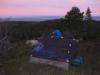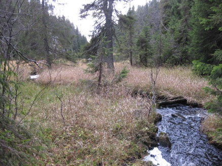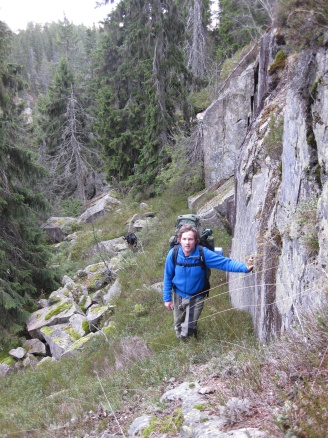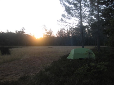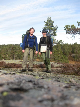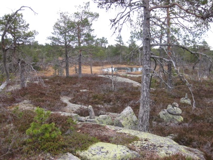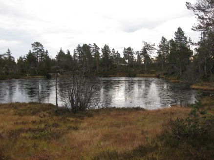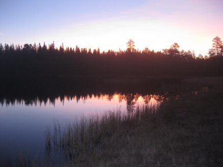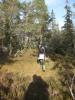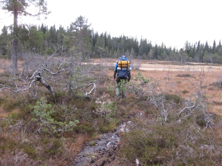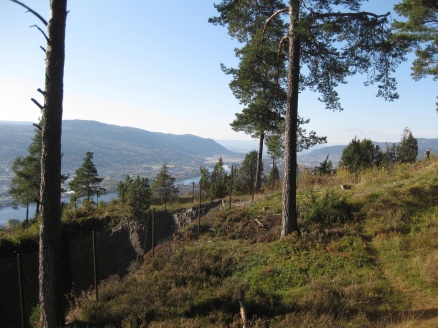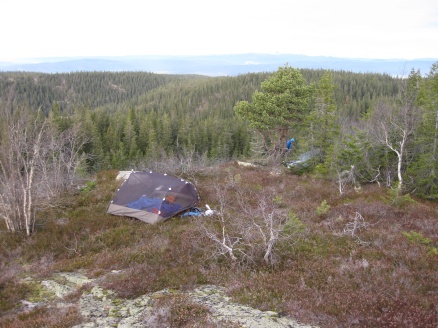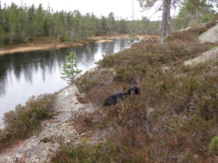 Torsdag kveld startet vi turen "Finnemarka på langs", fra Tyrifjorden (Vikersund) til Drammen. En kamerat, Elvis (bikkja) og jeg hadde planlagt turen noen uker tidligere, og torsdag kveld satte vi oss i bilen og kjørte i retning Vikersund. Startpunktet for turen var nordre del av Breili, nærmere bestemt Rognåsen. Vi hadde vært spente på hvordan været kom til å bli, da det hadde vært veldig skiftende de siste ukene. Derimot så det ut til torsdag kveld at vi ihvertfall fra starten ville få bra vær. Stjerneklart og nesten fullmåne. En bedre start kunne vi ikke få Vi parkerte bilen og begynte å gå innover i retning Breiliflaket, som er Finnemarkas høyeste punkt med 702 moh. Vi kom ikke igang før klokka var omtrent 21 på kvelden, så vi startet turen med hodelykter og gps.. Planen var i utgangspunktet å slå leir allerede ved Damtjern etter bare 2-3 km siden vi var kommet så seint igang. Vi kom raskt inn på en liten sti som gikk i riktig retning, og vi forflyttet oss relativt raskt til tross for mørket. Vi ble derfor enige om å forsøke å komme oss helt opp på Breiliflaket og slå leir der siden det var en så flott kveld med måneskinn. Fra Damtjern gikk vi bare etter kart og kompass videre mot toppen. Terrenget var kronglete, med tett skog og mye ulent terreng. Etter nesten 2 timer var vi allikevel oppe på toppen. Vi angret ikke da på at vi hadde valgt å gå den ekstra timen før vi slo leir:) Kjempeflott 360 graders utsikt! Lite vind, så stedet var perfekt som leirplass. Klokka var blitt over 23, så vi fyrte opp bål, slappet av med litt mat og tok kvelden.... Dag 2 (fredag): Dagen etter var like flott. Sol og bare et lett skylag gjorde utsikten enda mer imponerende i lyset. Etter frokost pakket vi sakene og fortsatte ferden sørover. Vi fulgte blåmerka sti innom Sandtjern og videre sørover gjennom barskogreservatet. Etter et par timer hadde vi passert "De pene tjenna" og gikk bort fra stien. Vi tok ut kursen vestover i retning Hovlandsfjellet. Terrenget her var veldig flott. Myrlendt, og åpen gammel furuskog. Vi befant oss nå på ca 600 moh. De neste 3-4 timene krysset vi ialt 4 åsrygger før vi var oppe i terrenget rett sør for Hvals- Broktjern. Dette var et tøft terreng. Noen steder var det så bratt at vi måtte leite etter steder hvor vi kunne komme opp uten å måtte klatre. Selv bikkja måtte hjelpes opp noen steder:) Dette var tydelig et område hvor det ikke var mange turgåere, og vi fikk faktisk litt følelsen av villmark.. Når så den siste av de 4 åsene var passert begynte vi å kjenne alle høydemeterne vi hadde klatret de siste timene, og fant ut at det var på tide med lunsj. Rett sør for Hvals-Broktern fant vi et lite vann det passet fint å slå seg ned ved. Tørrgran var det på alle kanter, så det tok ikke lenge tiden å få igang bålet. Vi tok en god rast. Fikk i oss litt mat og noen kopper kaffe før vi tuslet videre. Selv den ellers så aktive settern merket det tunge terrenget vi hadde gått i og fant seg en god plass å hvile borti lyngen:) Videre gikk ferden sørøstover i retning Langvann og Sponevollen. Den neste strekningen dit var veldig fin. Øde, åpent terreng med veldig mange småvann. Etter nedstigningen ned til Sponevollen fulgte vi grusveien et lite stykke øst til vi hadde passert Svartåsen. Da dro vi rett sørover fra veien, og nye 150-200 høydemeter før vi kom til Krokjern. Krogtjern er et lite, koselig vann på åsen midt mellom veien til Sponevollen og Svarvestolen (turisthytta). Her slo vi leir når kl nærmet seg 18.30. Da vi fant fram hodelyktene for å gjøre oss klare for mørkets frembrudd viste det seg at begge lyktene våre hadde streiket! Vi byttet batteri og sjekket over alle ledninger og alt, men nei ingen lys! At dette kunne skje med begge lyktene samtidig var for oss en gåte:) Etter en stund fant vi ut at festepunktet til ledningen på den ene lykta hadde smeltet kvelden før når jeg hadde hatt den på hodet og holdt på med bålet! At ikke håret tok fyr først er kanskje rart, men smeltet var den ihvertfall:) Vi hadde da ikke lenger noen lykter og måtte skynde oss å finne ved før det ble helt mørkt. Dette klarte vi akkurat i siste liten, og kunne sette oss velfortjent ned ved bålet etter en lang og strabasiøs dag. Lang, men utrolig flott dag! Dag 3 (lørdag): Nok en skyfri dag med strålende sol:) Natta hadde derimot vært kald. Det lå is på vannet, og temeraturen hadde nok vært nedi 6-8 kuldegrader. Vi fikk allikevel fort varmen etter noen kopper kaffe, og la i vei mot Svarvestolen. Fint terreng foruten at det var noen hogstfelt rett ved hytta. Beundret utsikten ut mot Glitre noen minutter, og spiste en kvikk-lunsj før ferden bar videre over Glitrehagan og ned mot Glitre. Derifra gikk vi i terrenget over til Sandungen istedenfor å måtte følge grusveien hele veien rundt Glitre. Når vi kom ned på veien ved Sandungen fulgte vi denne til Vrangla hvor vi spiste lunsj. Ved Vrangla møtte vi noen andre turgåere på "lørdagstur". Dette var faktisk første gangen siden vi startet på torsdag at vi møtte folk! Videre gikk det langs veien ned til Ulevann. Deretter fulgte vi blåmerket sti et stykke forbi Solbergvannet og Nerdammen før vi kom til Sørenden av Vrangen. Derifra gikk vi i terrenget på kurs til Tverråsvannet, hvor vi fortsatte stigningen opp på Tverråsen og bort til Vakkertjern. Navnet på dette vannet er selvforklarende.. Et utrolig idyllisk tjern med en flott odde hvor vi slo opp teltet. Igjen var vi avhengig av å få samlet ved før mørket kom. Her oppe hadde det tydeligvis vært flere mennesker innom enn der vi hadde slått leir tidligere, for det var vanskeligere å finne tørr ved i nærheten. Jobbet litt for å sanke nok ved til hele kvelden, men omsider hadde vi fått samlet en god haug. Denne kvelden delte vi de 2 pakkene med bacon vi hadde båret på i flere dager. Det smakte... Dag 4 (søndag): Fjerde og siste dag skulle vi bare siste etappe over Tv